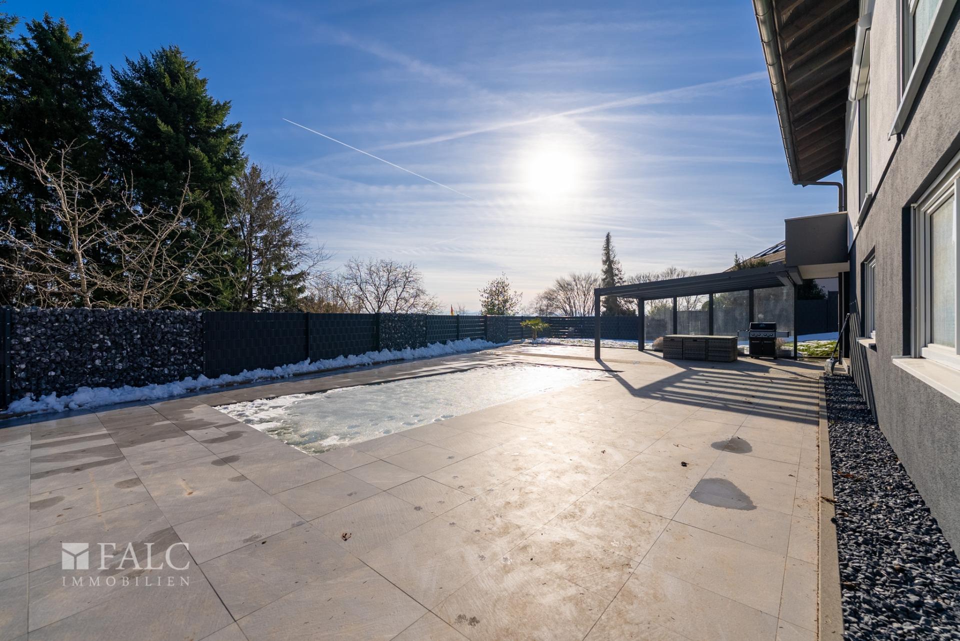 Im Erdgeschoss finden Sie den hellen Wohnbereich, der durch große Fensterfronten viel Tageslicht erhält und einen direkten Zugang zum Balkon hat. Der Balkon bietet einen schönen Blick auf den Pool und den gepflegten Garten und in der Ferne auf die Schweizer Alpen.