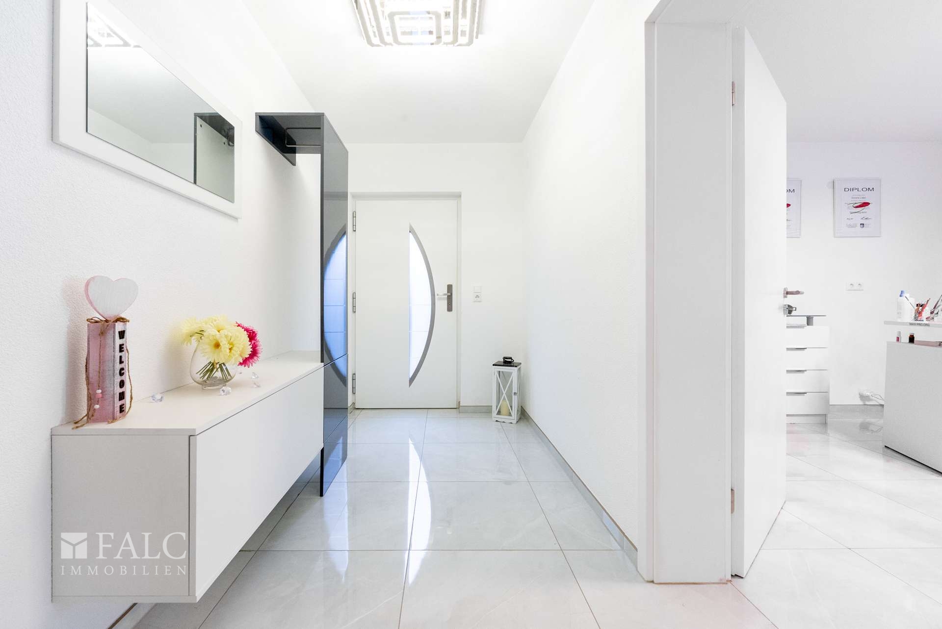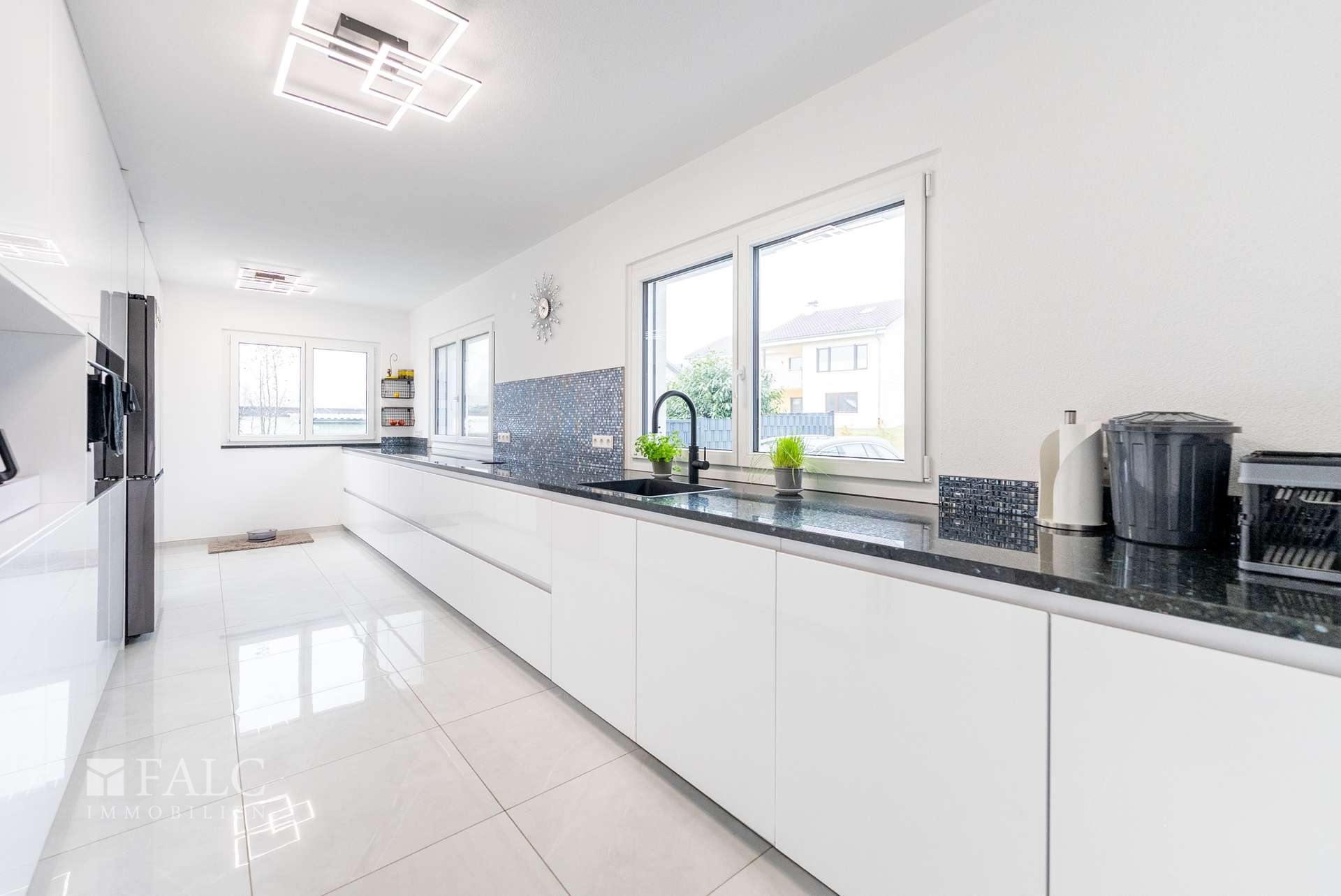 Rechts vom Flur liegt die moderne Küche, die mit hochwertigen Geräten ausgestattet ist, ideal für Familien, die gerne gemeinsam kochen und essen.