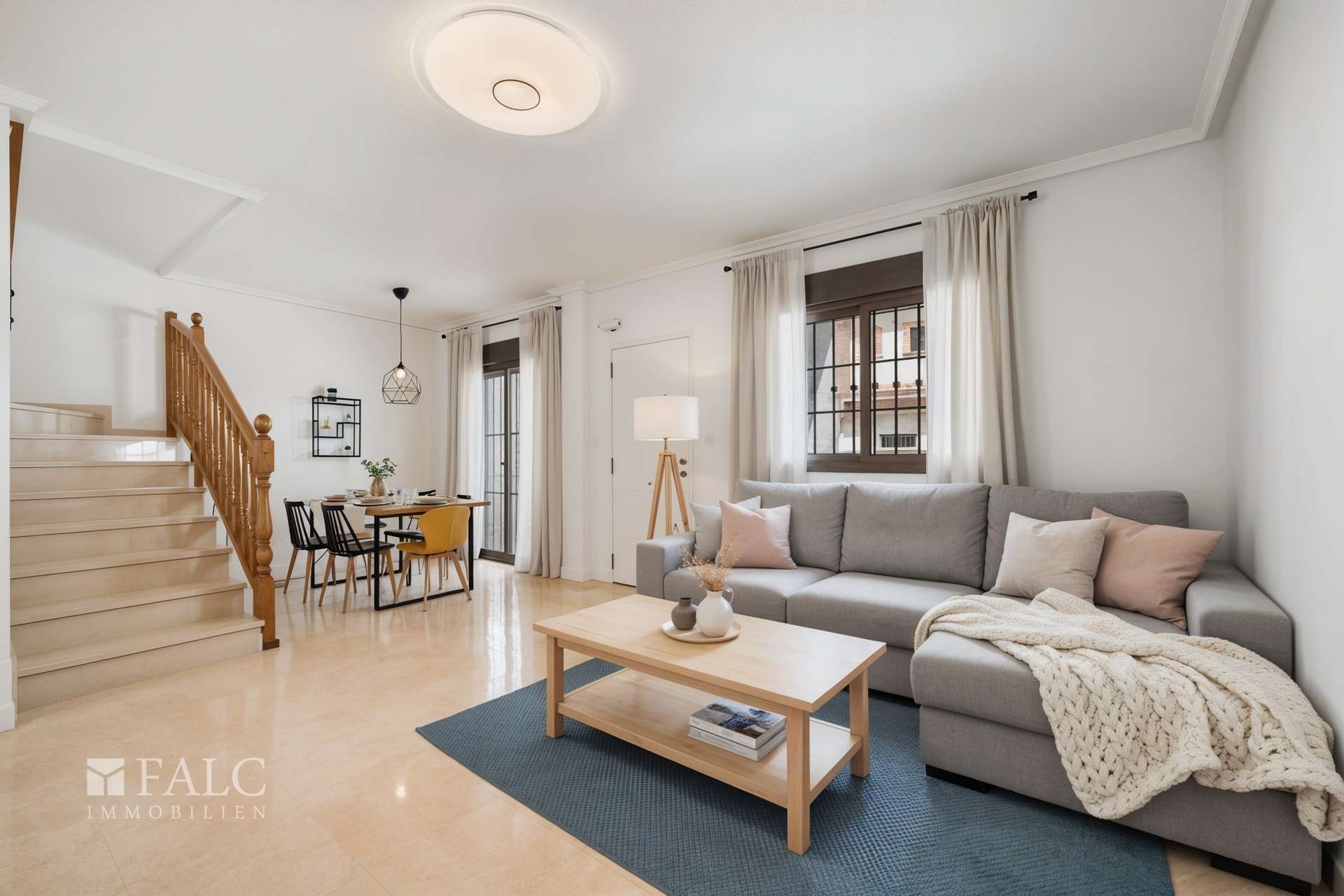 Im Obergeschoss befinden sich drei Schlafzimmer, die alle hell und freundlich gestaltet sind. Das Hauptschlafzimmer bietet Zugang zu einem weiteren Balkon, ideal für einen ruhigen Morgenkaffee. Zwei moderne Bäder sorgen für Komfort und Privatsphäre.