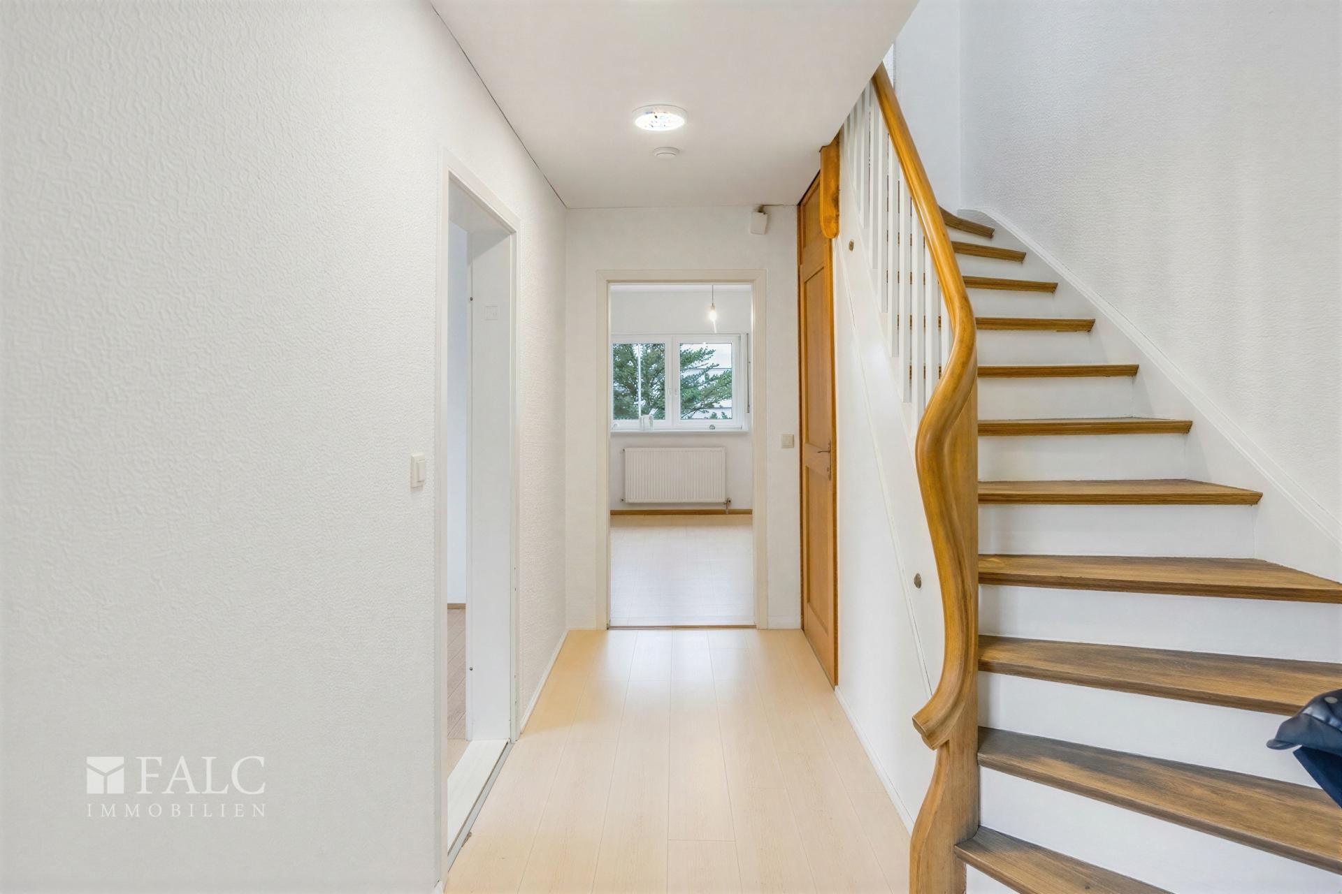 Im Erdgeschoss empfängt Sie ein Eingangsbereich, der in den Flur führt und die Räume angenehm voneinander trennt. Von hier aus erreichen Sie das Badezimmer sowie die Küche und ein großzügig geschnittenes Zimmer, das sich je nach Bedarf als Wohnbereich, Esszimmer oder auch als ruhiger Arbeitsraum nutzen lässt. Die Wege bleiben kurz und nachvollziehbar, wodurch der Alltag im Haus unkompliziert organisiert werden kann.