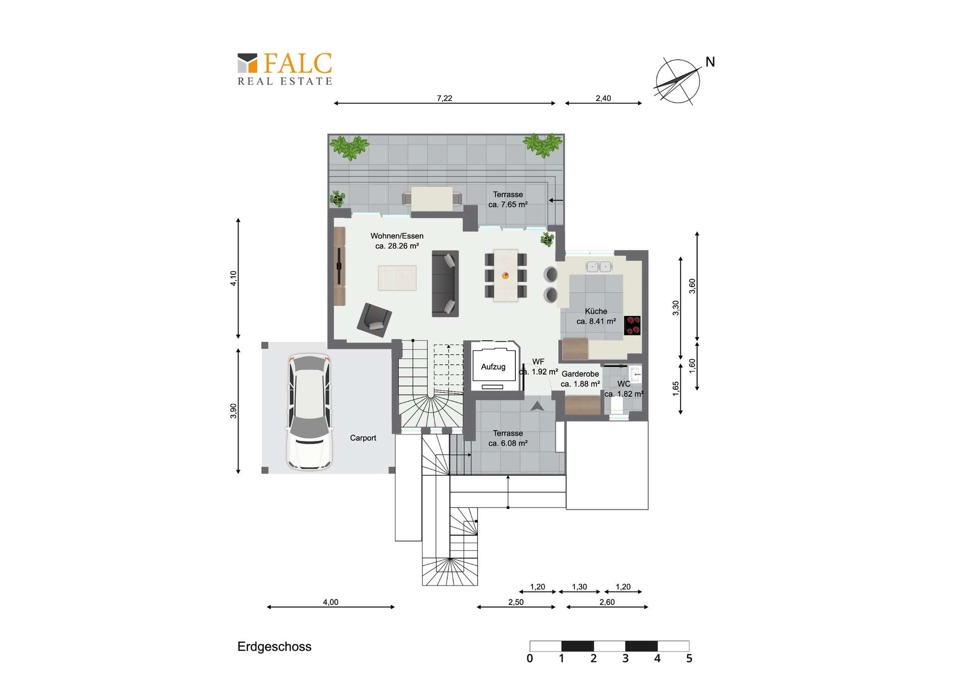 Im Erdgeschoss empfängt Sie ein großzügiger Eingangsbereich, der den modernen Gestaltungsansatz des Hauses sofort erlebbar macht und die Wege logisch verteilt. Der Zugang zum Gebäude sowie die gesamte Erschließung dieser Ebene sind behindertengerecht ausgeführt. Rampen ermöglichen einen barrierearmen Zutritt, während ein Aufzug innerhalb des Gebäudes eine komfortable und stufenlose Verbindung zwischen den Etagen sicherstellt. Ergänzt wird das Erdgeschoss durch ein Gäste-WC sowie das zentral angeordnete Treppenhaus, das sich harmonisch in das klare Gesamtbild einfügt.