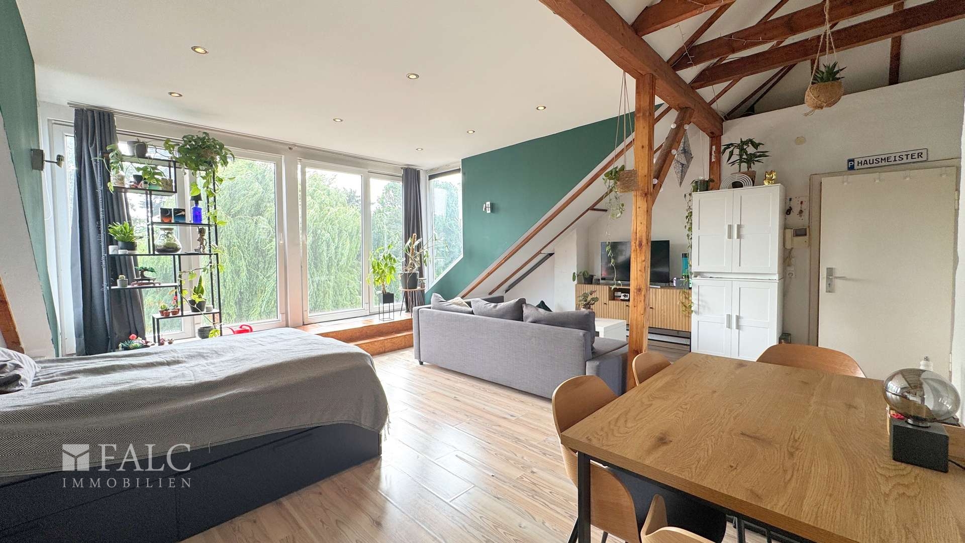 Das Dachgeschoss dieser Immobilie präsentiert sich als stilvoller Wohn-, Schlaf- und Essbereich in offener Raumgestaltung. Bodentiefe Fenster durchfluten den Raum mit Licht und eröffnen einen herrlichen Blick in den gepflegten Garten – ein echtes Wohlfühlambiente mit Loft-Charakter. Das Badezimmer ist mit einer Badewanne ausgestattet und bietet somit auch im Dachgeschoss entspannenden Komfort. Ein ca. 4 m² großer Abstellraum ergänzt das Platzangebot und sorgt für praktischen Stauraum im Alltag. Bei diesem charmanten Dachgeschoss handelt es sich um wohnwertrelevante Nutzfläche, die derzeit für eine monatliche ortsübliche Warmmiete vermietet ist.