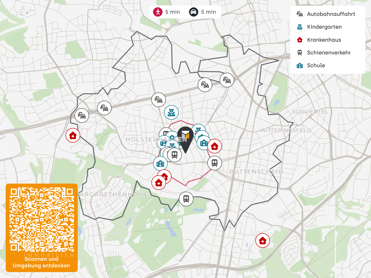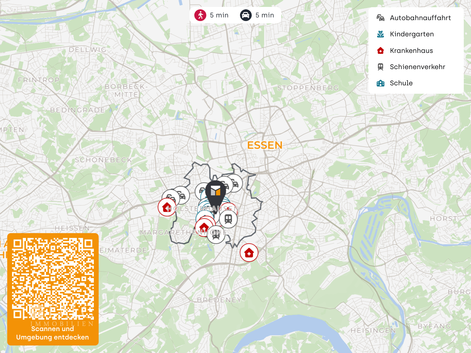 Die Anbindung an den öffentlichen Nahverkehr sowie zur Universitätsklinik Essen ist ausgezeichnet. Wer nach Entspannung vom Stadttrubel sucht, findet in der Umgebung zahlreiche grüne Rückzugsorte: Neben dem bekannten Grugapark laden auch die Margaretenhöhe und das idyllische Nachtigallental zu Spaziergängen ein.