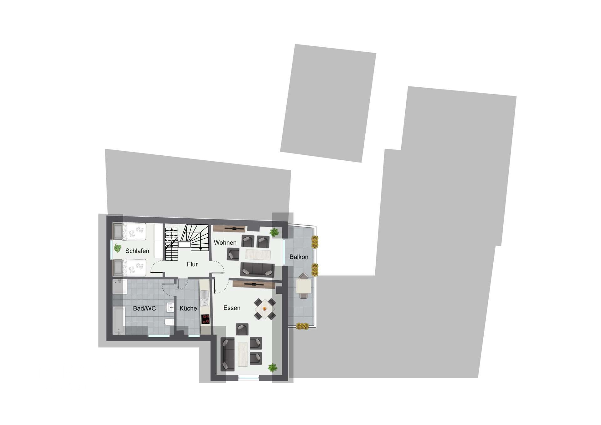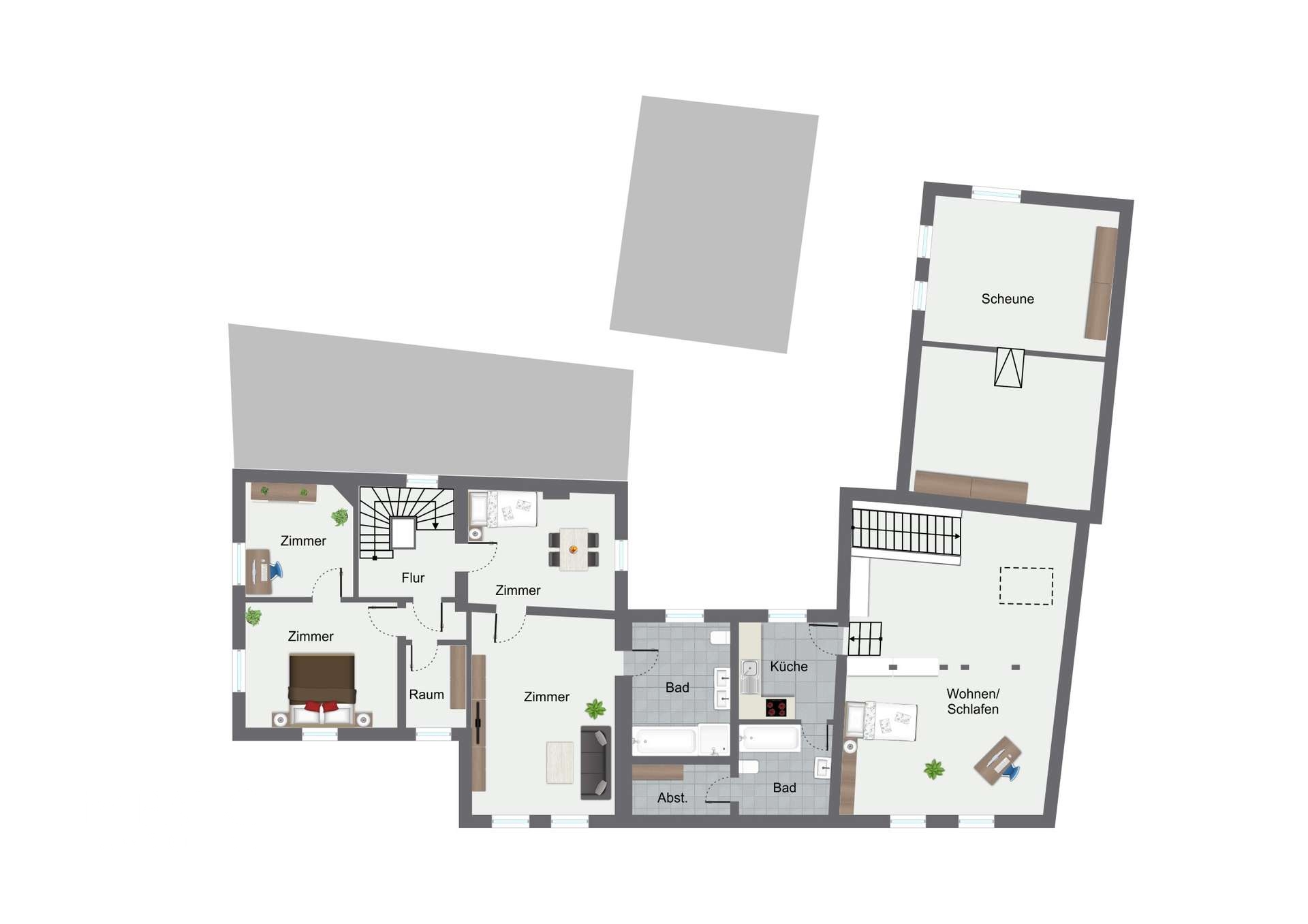 Mehrere Einheiten stehen perspektivisch zur freien Verfügung, darunter die etwa 95 m² große Dachgeschosswohnung sowie die rund 88 m² umfassende Einheit über der Scheune. Dadurch entsteht wertvoller Raum für individuelle Wohnkonzepte, etwa separate Bereiche für erwachsene Kinder, Großeltern im eigenen Wohnbereich oder gemeinsames Leben mit ausreichend Privatsphäre für alle Generationen.