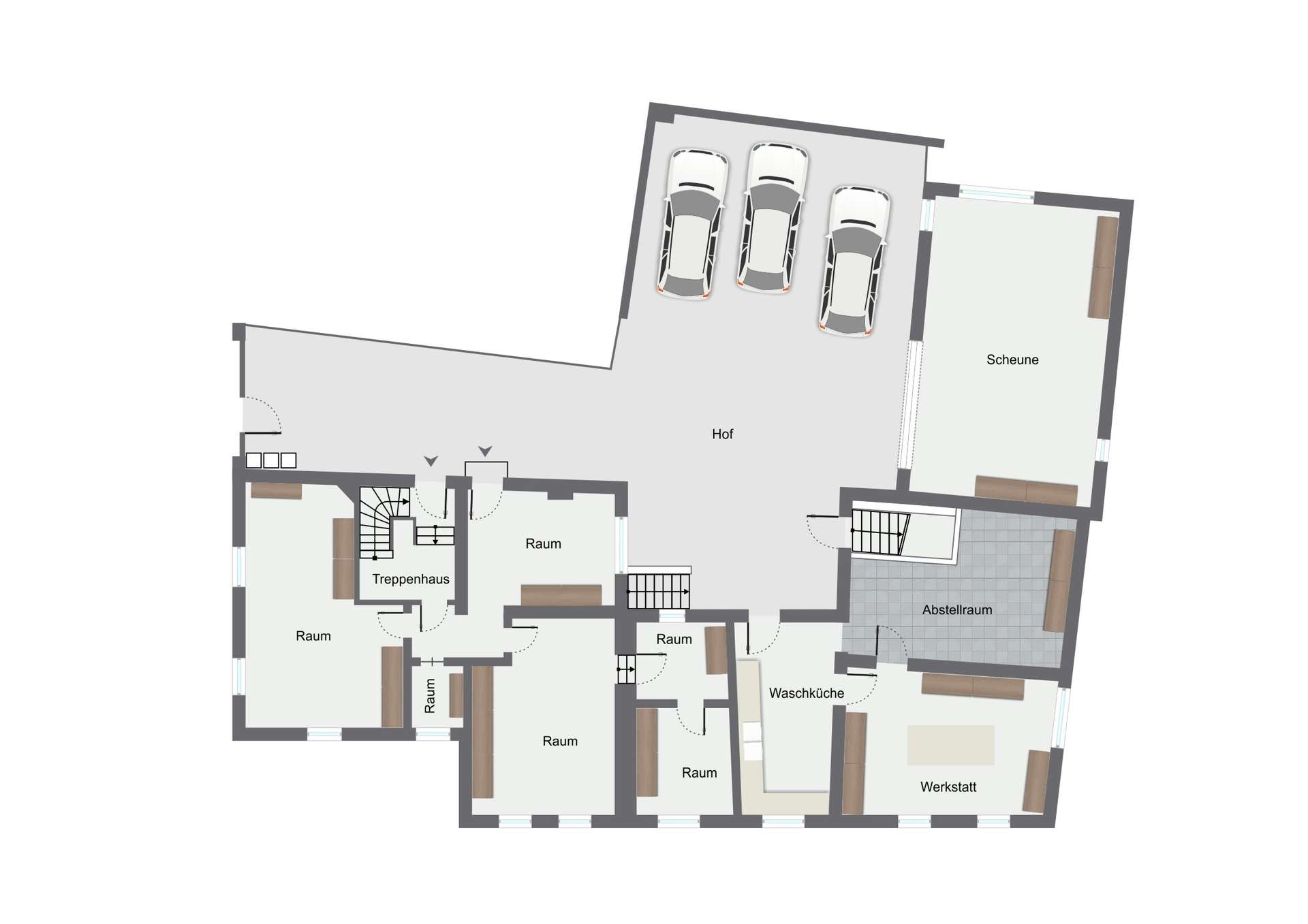 Die Fenster der Wohnungen sind überwiegend doppelt verglast, teils aus PVC, teils aus Holz. In der Scheune sowie im angrenzenden Werkraum sind teilweise noch einfach verglaste Fenster vorhanden.