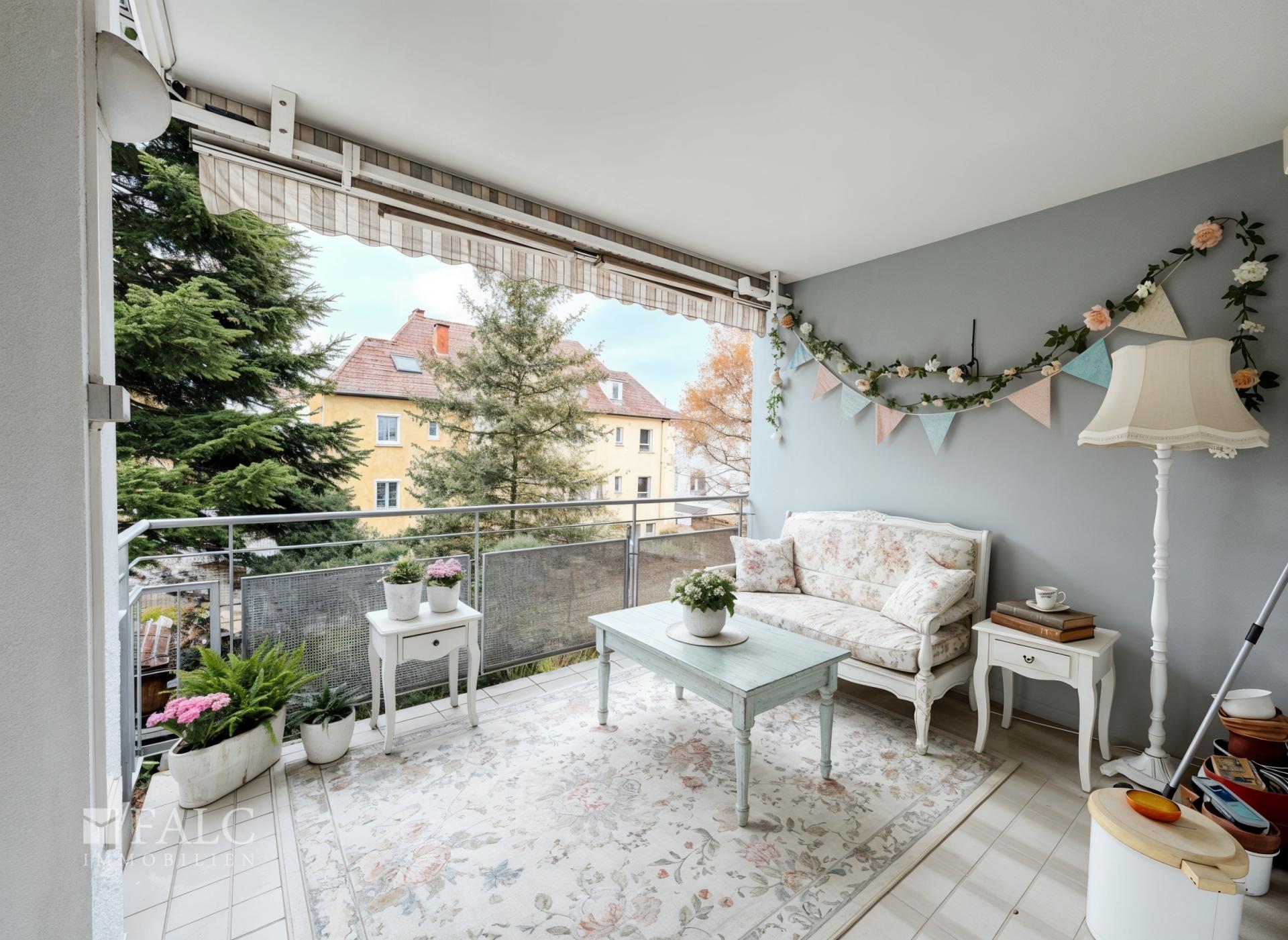 Geradeaus gelangen Sie in das helle Wohnzimmer, das durch große Fenster viel Tageslicht bietet. Der Raum verfügt über genügend Platz für eine gemütliche Sofaecke und einen Essbereich. Von hier aus haben Sie Zugang zum großzügigen Balkon, der zum Entspannen im Freien einlädt und einen schönen Blick ins Grüne bietet.