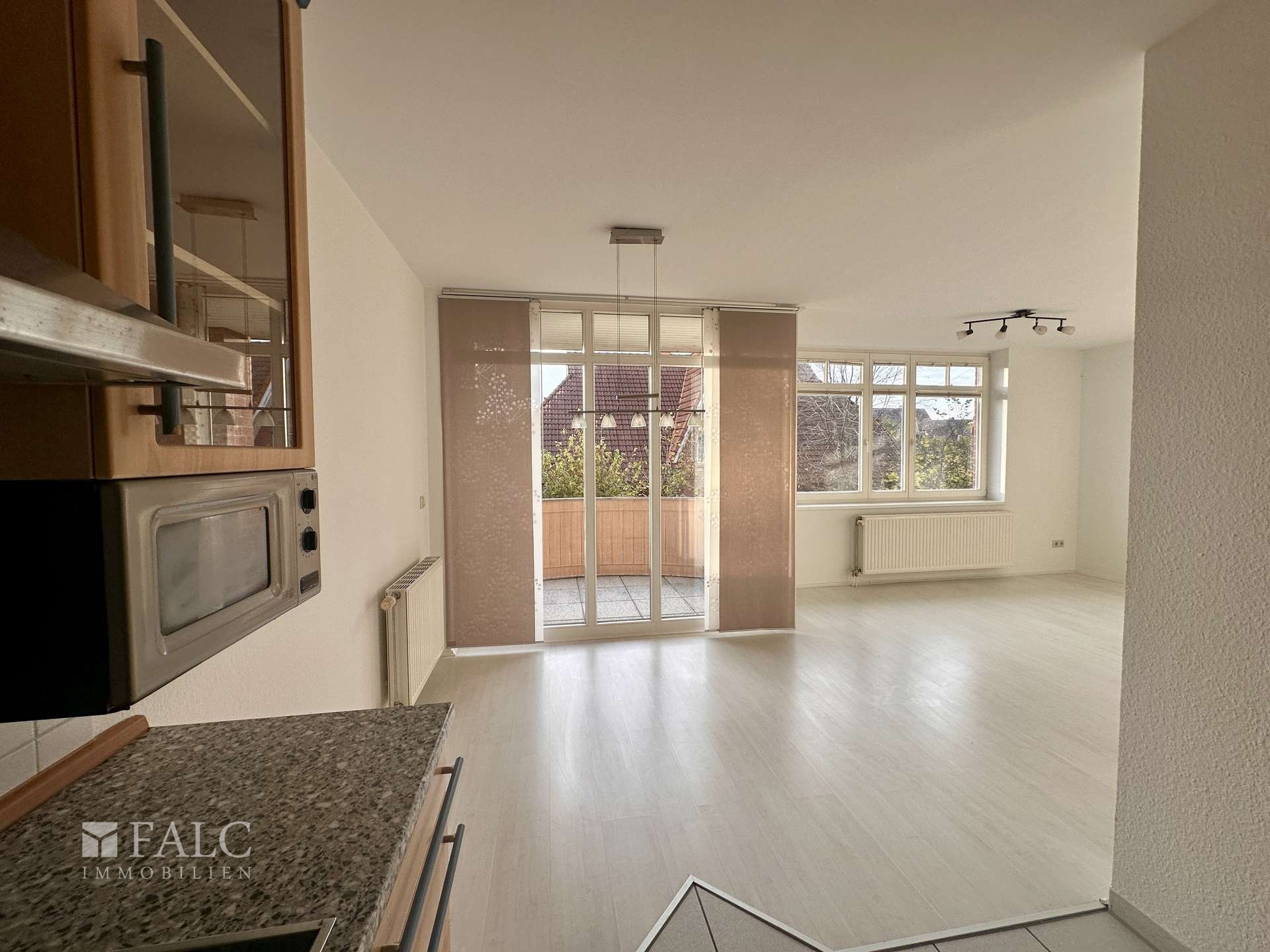 Das großzügige und helle Wohnzimmer mit seiner offenen Küche lädt Sie zu gemütlichen Stunden ein. Von hier gelangen Sie auf den sonnigen Balkon mit Blick ins Grüne, auf dem Sie wunderbar die Seele baumeln lassen können.