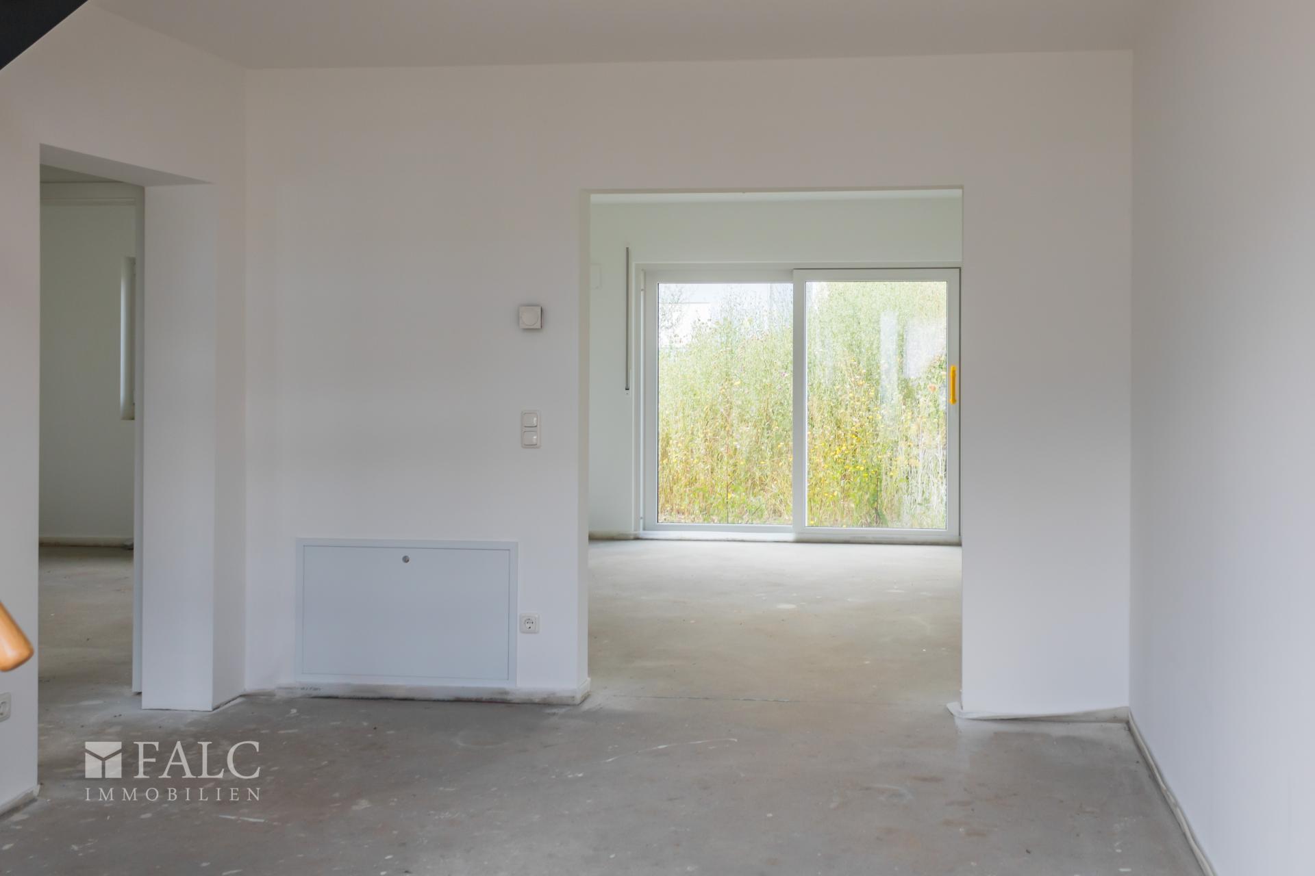 Eine offene Küche auf der einen Seite, ein leicht zurückversetzter, gemütlicher Wohnzimmerbereich auf der anderen Seite und zentral ein Erker mit großer Hebe-Schiebetür und freiem Blick in den Garten bieten eben genau dieses helle, leichte, freundliche Wohngefühl, welches modernes Wohnen ausmacht.