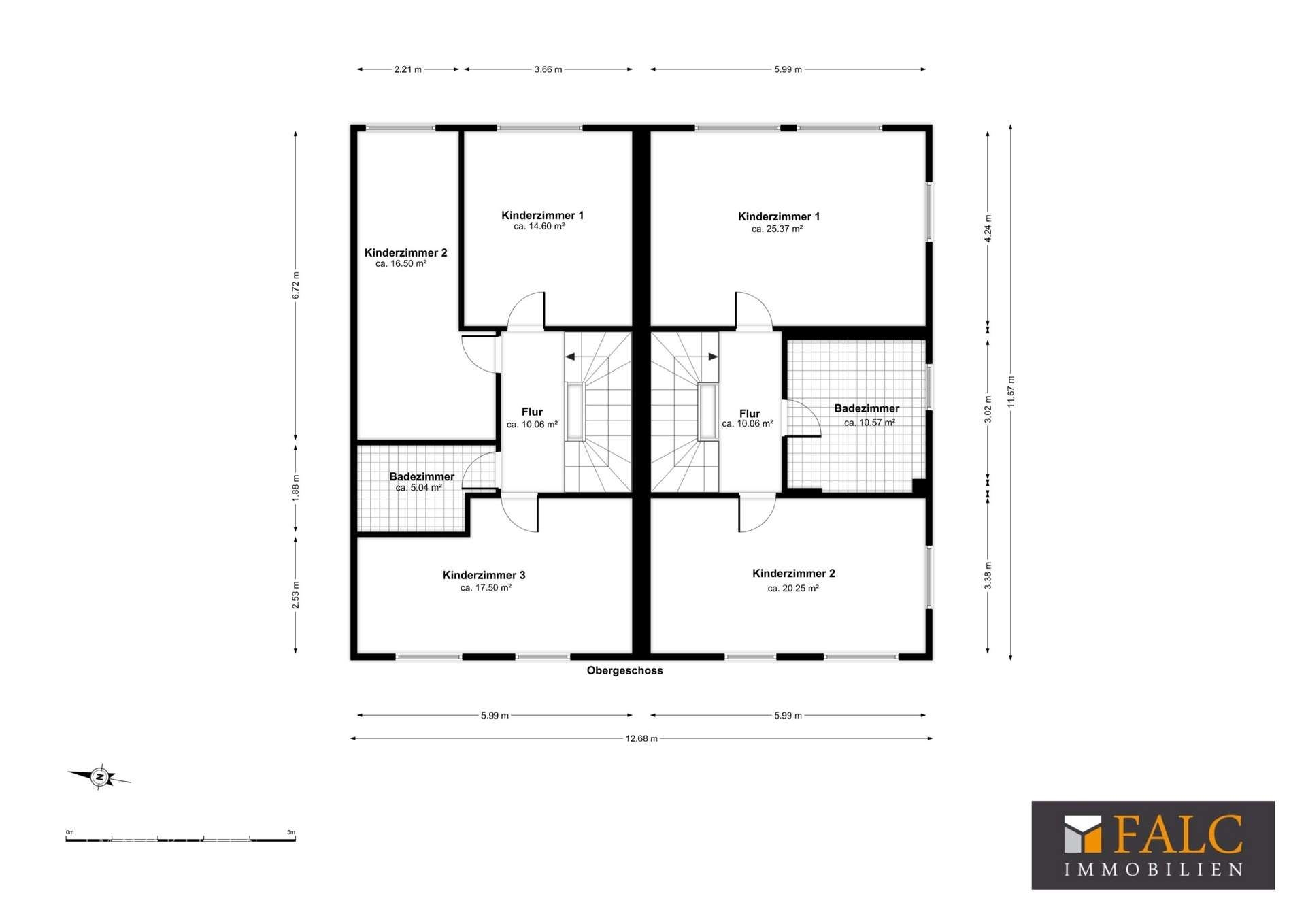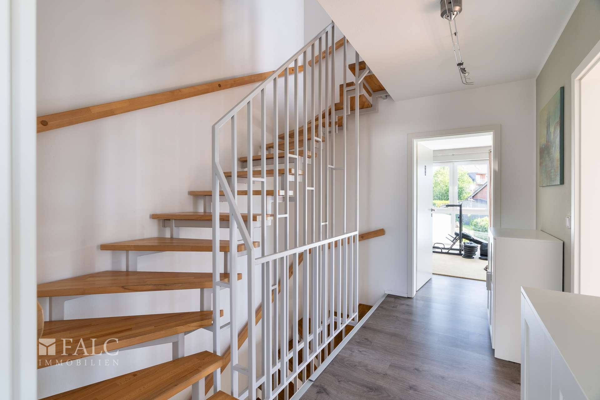 Über eine gepflegte Treppe mit Buchenholzstufen gelangen Sie ins Obergeschoss, das den privaten Rückzugsbereich der Familie bildet. Dort befinden sich zwei gut geschnittene Schlafzimmer, ein großzügiger Flur sowie das Familienbad mit Doppelwaschbecken, Badewanne, Dusche und Tageslicht – ideal für Familienalltag und entspannte Wellnessmomente.