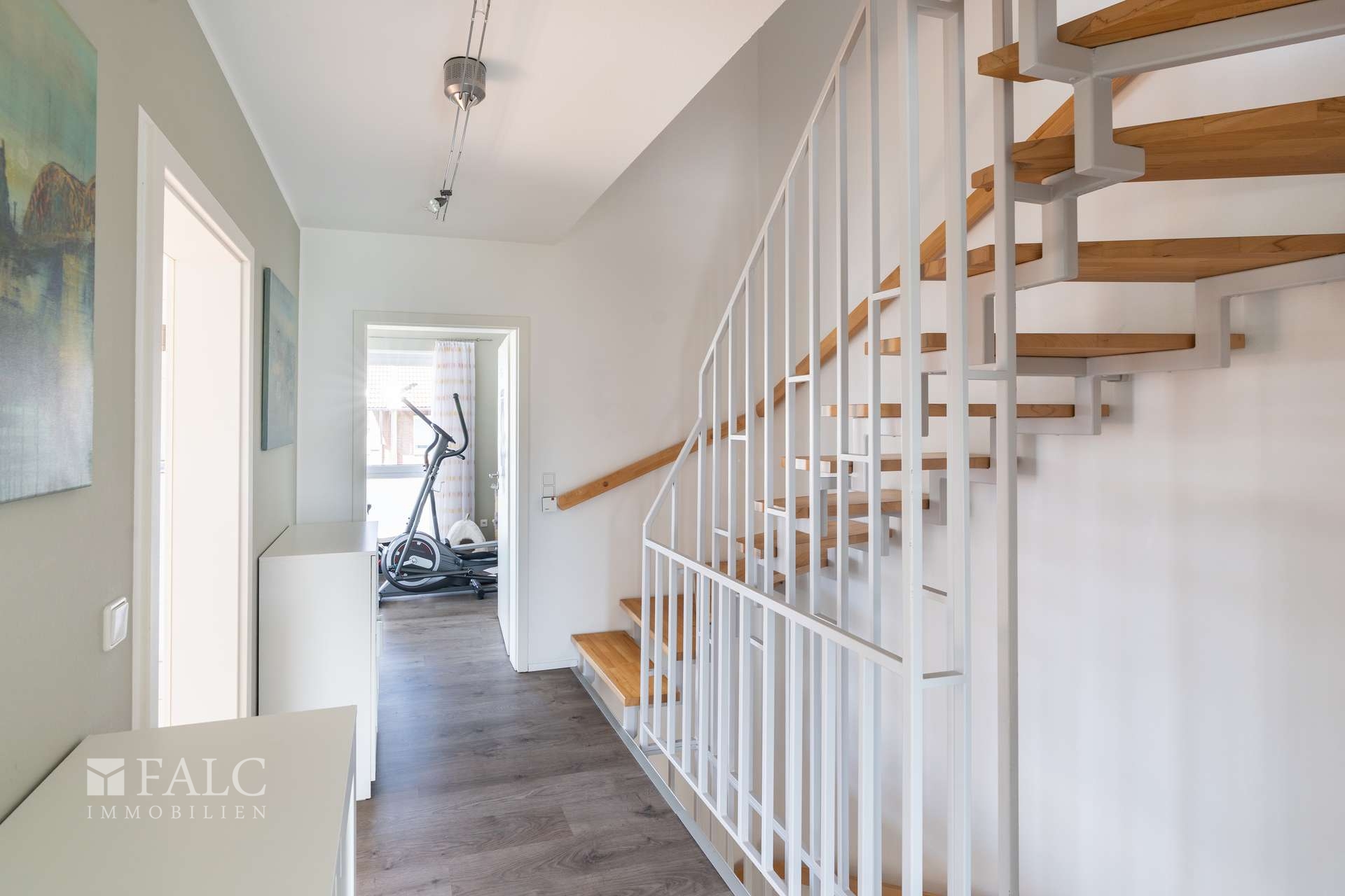 Insgesamt präsentiert sich die Immobilie in einem sehr gepflegten Zustand, funktionaler Ausstattung und einem zeitgemäßen Gesamtambiente. Die Ausstattung überzeugt durch ihre Hochwertigkeit und Funktionalität: moderne Elektroinstallation inkl. zahlreicher Steckdosen, Telefon- und TV-Anschlüsse, Kunststofffenster mit Rollläden (EG und 1. Etage elektrisch), Fußbodenheizung in Erd- und Obergeschoss und zentrale Gasheizung mit Warmwasserspeicher.