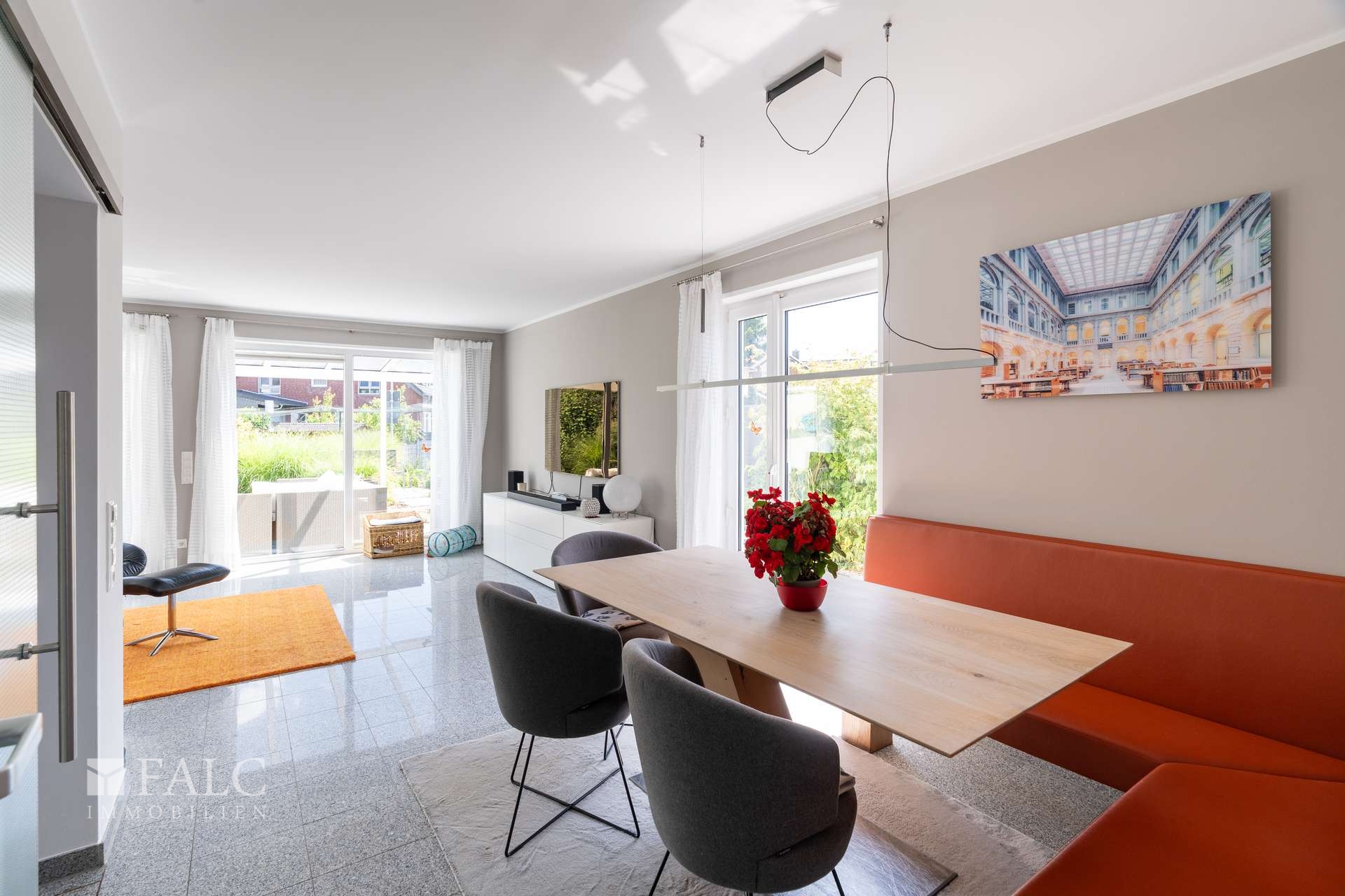 Das Erdgeschoss empfängt Sie mit einem hellen Eingangsbereich, einem praktischen Gäste-WC sowie einem Abstellraum. Herzstück der Etage ist der offene Wohn-Essbereich, der durch große Fensterflächen lichtdurchflutet ist und über zwei separate Zugänge zu den Außenbereichen verfügt – einmal zur seitlichen Terrasse und einmal zur Hauptterrasse mit Glasüberdachung und direktem Gartenanschluss. Die Küche ist separat angeordnet und funktional ausgestattet.