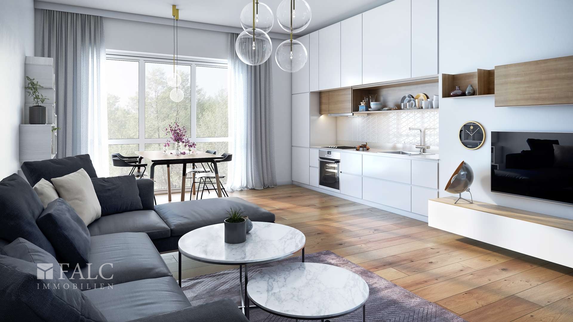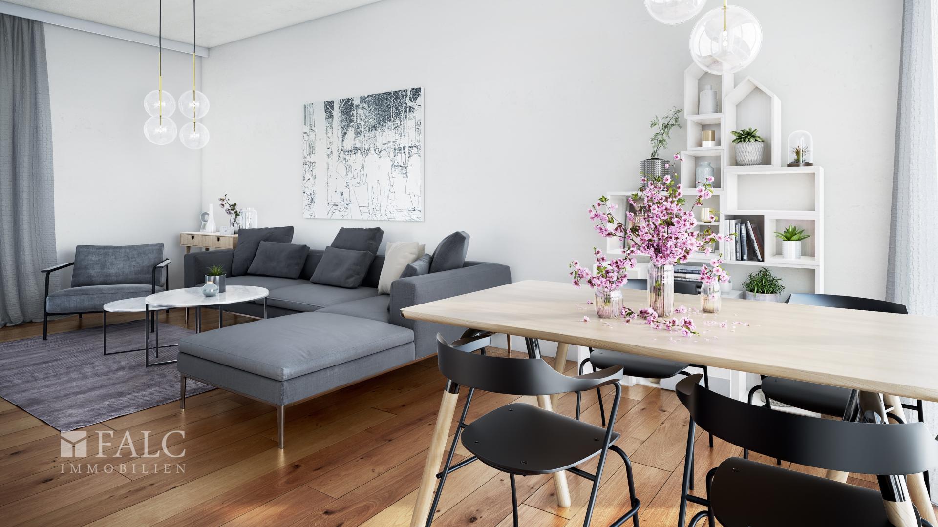Ein repräsentatives Entrée mit Videosprechanlage inkl. App-Funktion, weiß lackierte Innentüren mit Design-Türbeschlägen, offene Architekturen, bodentiefe Fenster, ein großer Balkon, eine offene Küche, hochwertigste Materialien - wer dies zu schätzen weiß, ist hier goldrichtig!