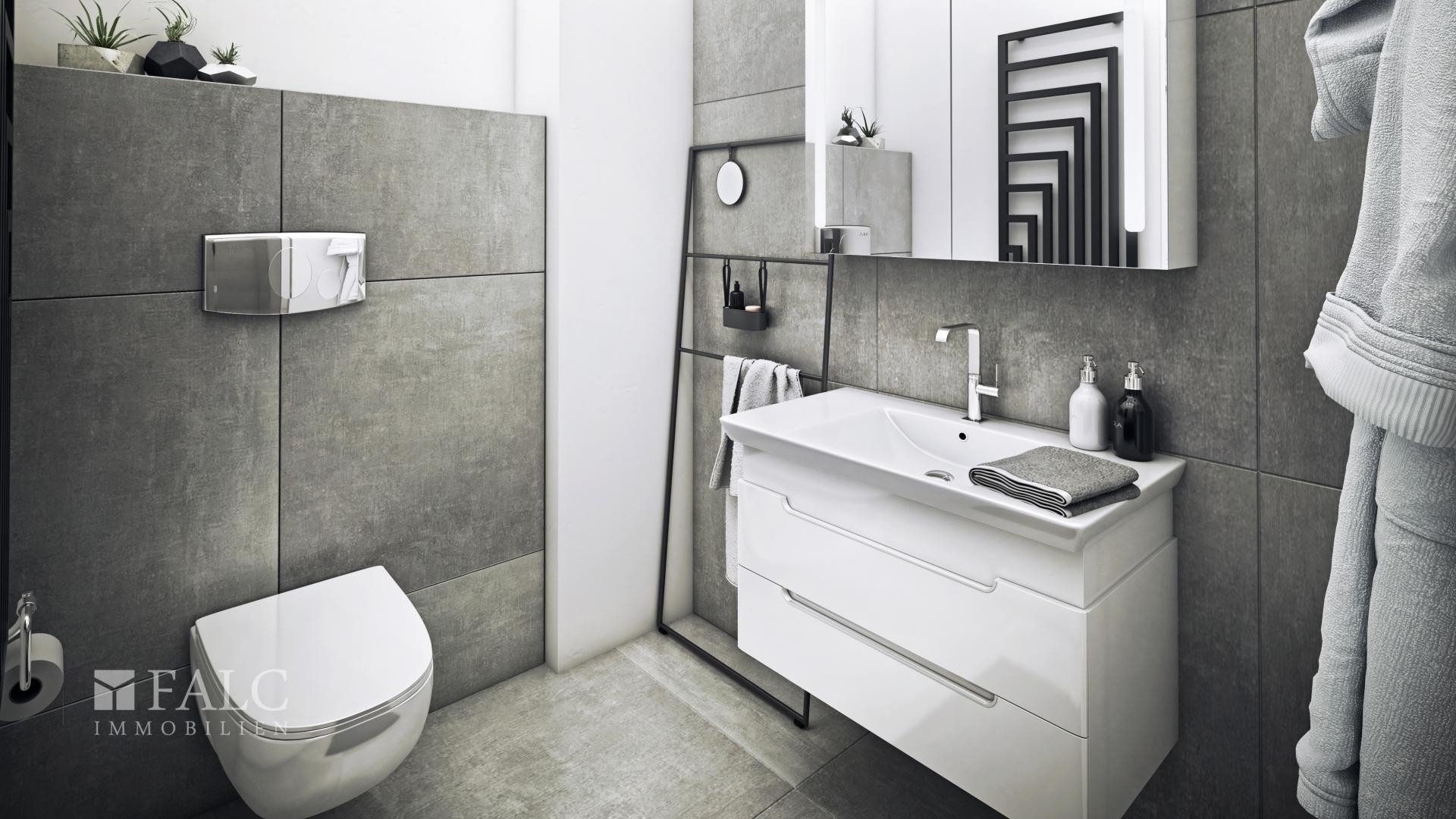 Die Bäder verfügen über eine bodengleiche Dusche, Wanne, Waschtisch mit Unterschrank und WC sowie einer Glas-Duschkabine. Die hochwertigen Armaturen von Grohe und die vorhandene vollständige Ausstattung des Bades sind im Kaufpreis inbegriffen.