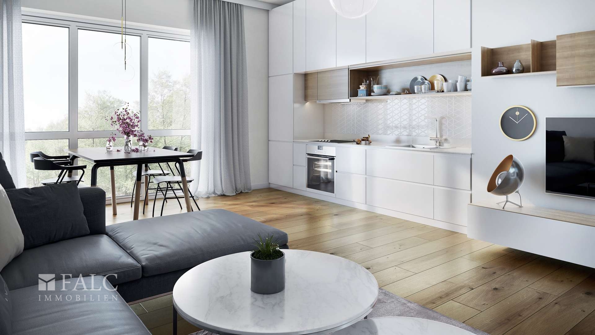 Ein repräsentatives Entrée mit Videosprechanlage inkl. App-Funktion, weiß lackierte Innentüren mit Design-Türbeschlägen, offene Architekturen, bodentiefe Fenster, ein großer Balkon, eine offene Küche, hochwertigste Materialien - wer dies zu schätzen weiß, ist hier goldrichtig!