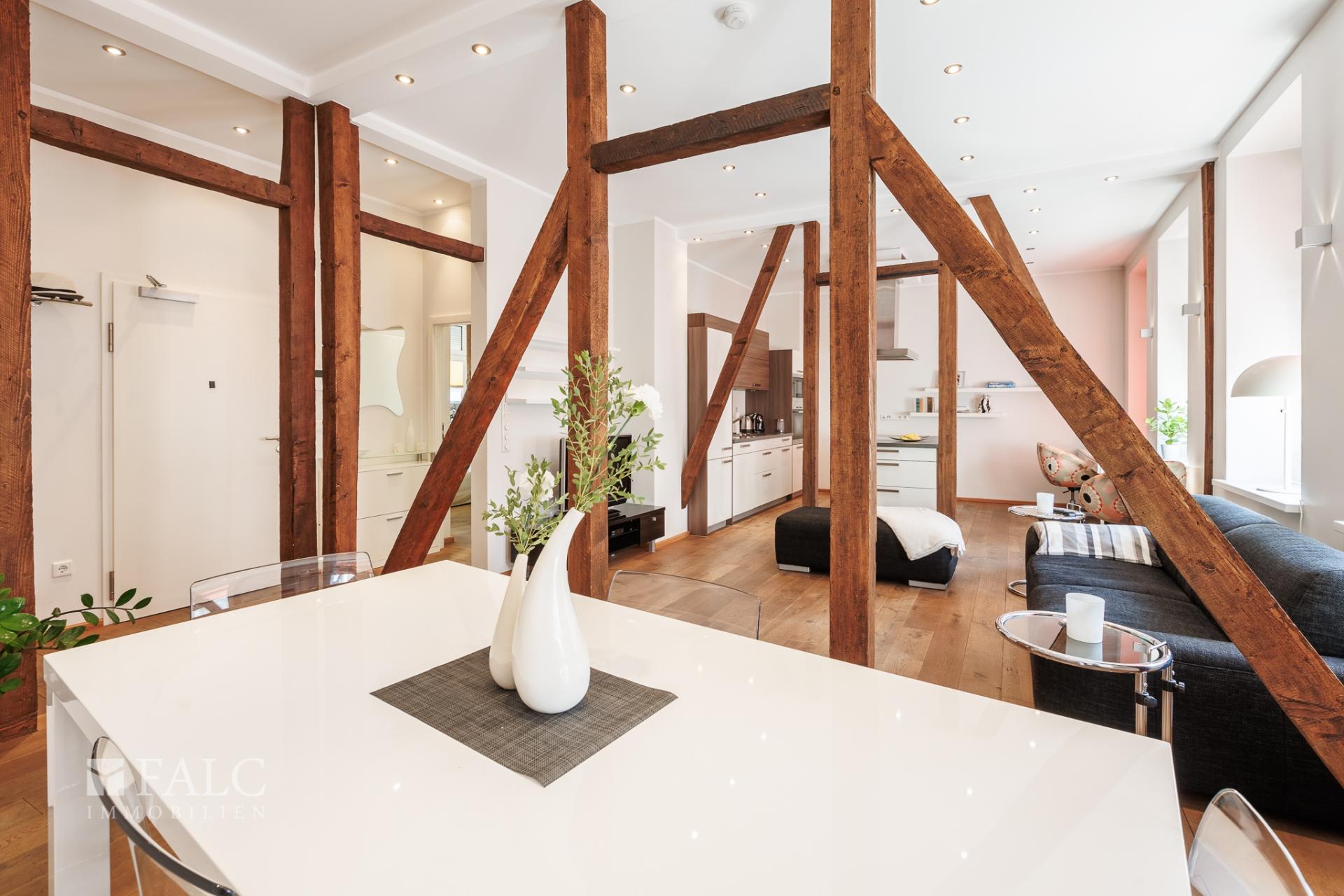 Im ersten Obergeschoss befindet sich eine weitere 2-Zimmer-Wohnung mit ca. 67 m². Sie verfügt über einen großen, offenen Wohn-Essbereich mit moderner Miele Küche aus 2024 (Eigentum Hausbesitzer), ein Schlafzimmer mit angrenzendem Tageslichtbad, das sowohl mit einer Dusche als auch mit einer Badewanne ausgestattet ist. Die Schlafzimmerfenster nach hinten verfügen über elektrische Rollladen. Diese sind bereits bei der Kernsanierung des gesamten Hauses 2006/2007 eingebaut worden. Auch dieser Wohnung ist ein separater Abstellraum im Hausflur zugeordnet.
