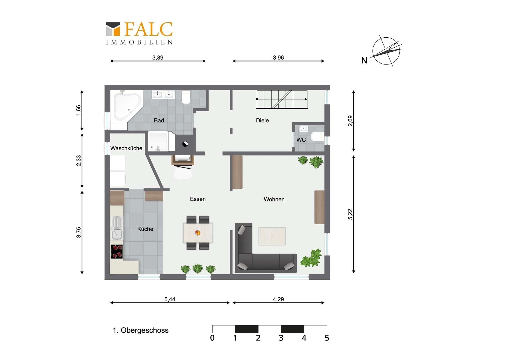 Ein großzügiger Wohn- und Essbereich mit offener Küche, ein Tageslichtbad mit Eckwanne und Dusche und eine Waschküche erwarten Sie im 1. Obergeschoss.