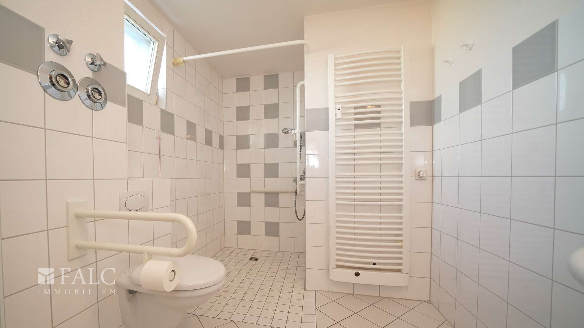 Das barrierefrei ausgestattete Badezimmer mit ebenerdiger, großzügiger Dusche, einem modernen Waschbecken und einem WC. Für mehr Sicherheit sorgen Haltegriffe, für das Kuschelerlebnis nach der Dusche wärmt der schicke Handtuch-Heizungskörper Ihr Handtuch vor. Auch Ihre Waschmaschine findet hier problemlos Platz. Weiße Wand- und Bodenfliesen machen das Bad pflegeleicht und freundlich.