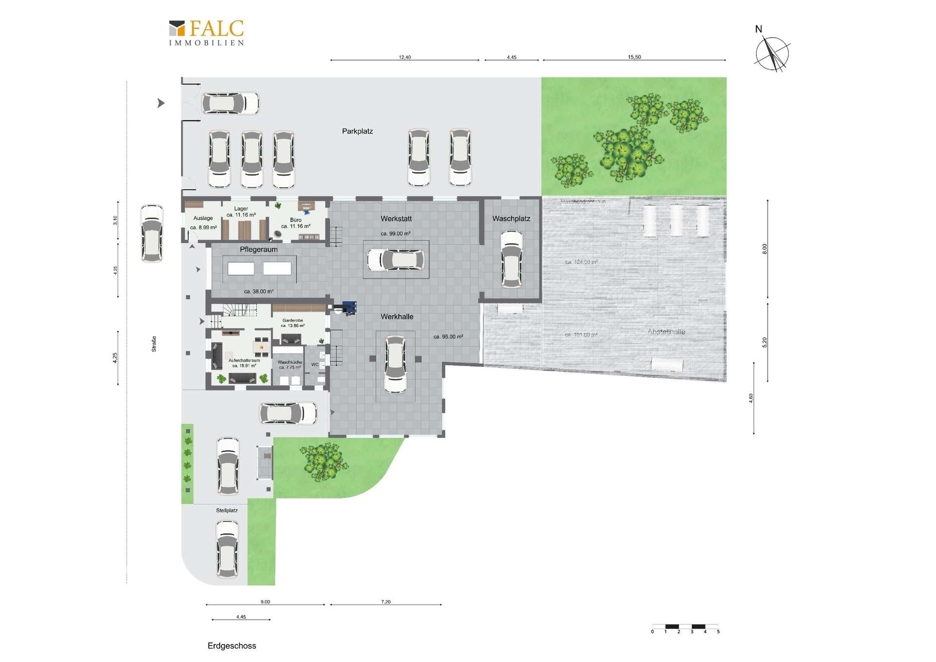 Das Erdgeschoss umfasst die Gewerbeeinheit mit circa 299 m² eine Werkstatt und eine Werkhalle für die Instandsetzung von PKW und den Reifenservice zur Verfügung, einen Pflegeraum und einen Waschplatz für Aufbereitungen. Auch an ein Lager und einen Empfang mit Verkaufsauslage wurde gedacht.