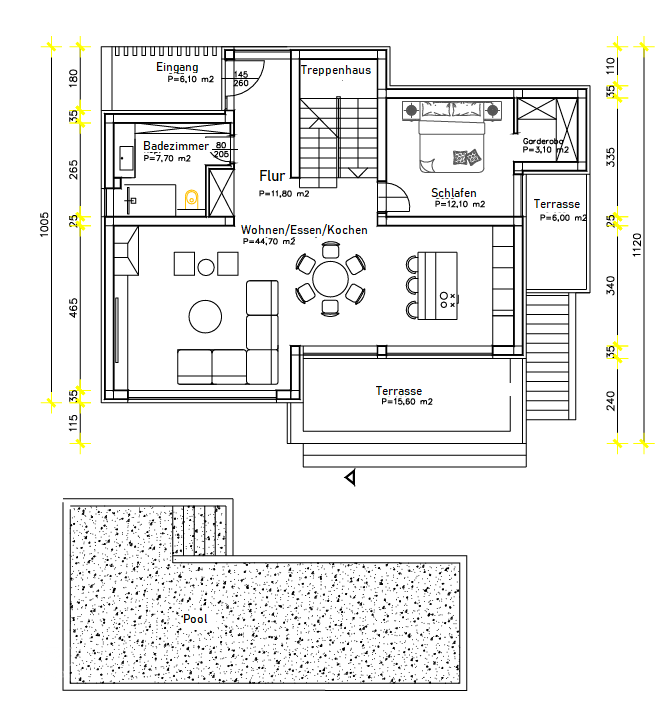 Das Erdgeschoss bildet das Herzstück der Villa und überzeugt mit einem eleganten Wohn- und Essbereich samt offener Küche und direktem Zugang zur Terrasse mit Swimmingpool und Garten. Ein komfortables Schlafzimmer mit begehbarer Garderobe und Zugang zu einer eigenen Terrasse sowie ein stilvolles Badezimmer runden diese Wohnebene harmonisch ab.