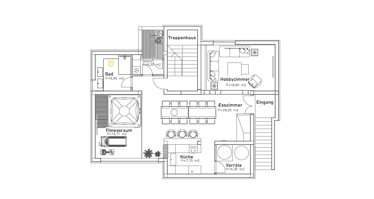 Im Souterrain eröffnet sich ein vielseitiger Wellness- und Freizeitbereich mit Sauna, Fitnessraum und Hobbyzimmer. Ergänzt wird diese Ebene durch ein Badezimmer sowie ein großzügiges Wohn- und Esszimmer mit offener Küche und praktischem Vorratsraum – ideal für entspannte Stunden oder gesellige Abende in privater Atmosphäre.