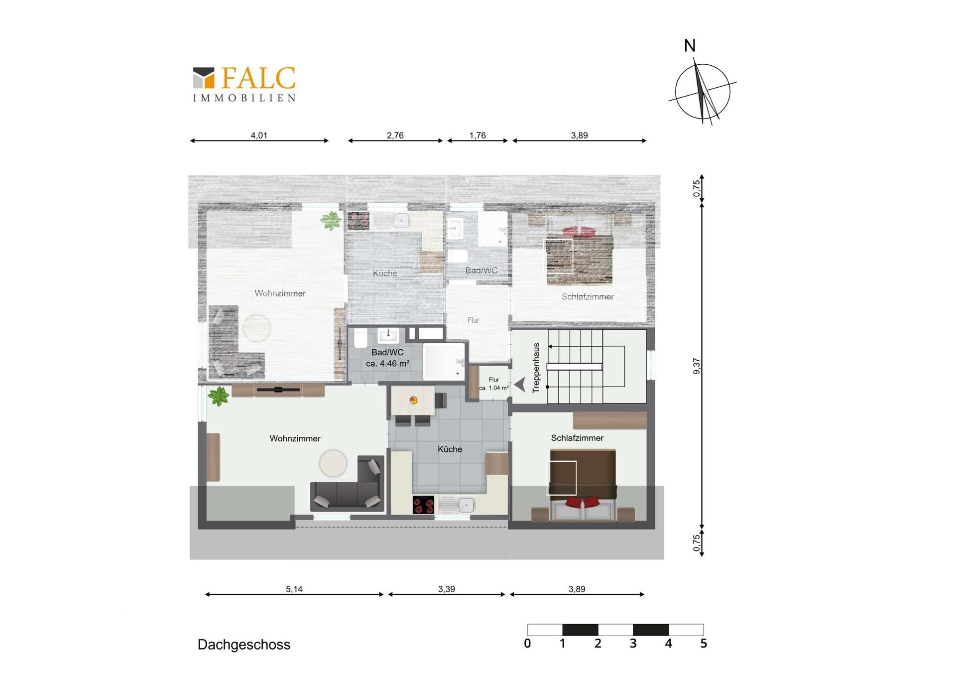 Ein geschickt geschnittener Flur empfängt Sie im Dachgeschoss, in dem problemlos ein Garderobenschrank für Ihre Jacken und Schuhe aufgestellt werden können. Im Anschluss stehen Sie, in amerikanischer Art, im Herzen der Wohnung, der offenen Küche.
