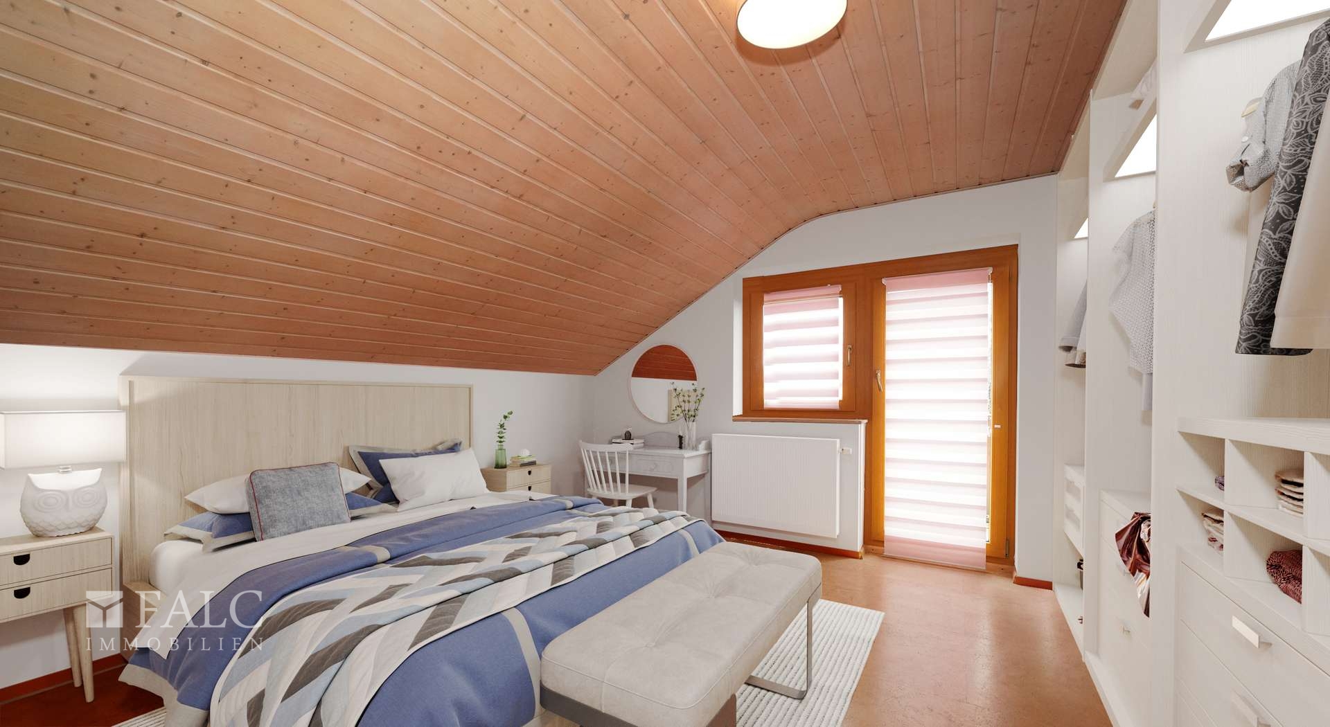 Das Obergeschoss überzeugt mit einem großzügigen Wohnbereich und einem großen Schlafzimmer, beide mit Zugang zum Westbalkon. Zwei weitere Zimmer bieten flexible Nutzungsmöglichkeiten, ergänzt durch ein helles Tageslichtbad mit Eckwanne und separater Dusche.
