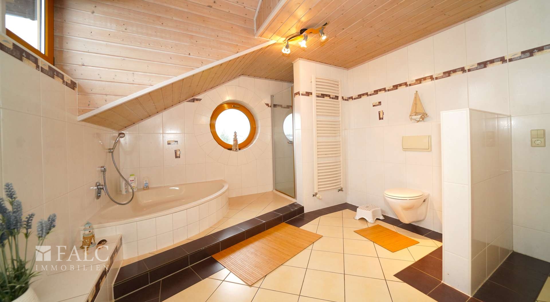 Schaumkronen ahoi: Ein geschmackvolles Träumchen, das Sie zum Entspannen einlädt, wartet in Weiß mit warmen Beigetönen, harmonierend mit der warmen Holzvertäfelung an der Decke. Eine ebenerdige Dusche für die Erfrischung zwischendurch und eine große Eckbadewanne für ausgiebige Schaumbäder werden ergänzt durch ein WC und ein großes Waschbecken. Durch das Fenster stylen Sie sich bei Tageslicht.