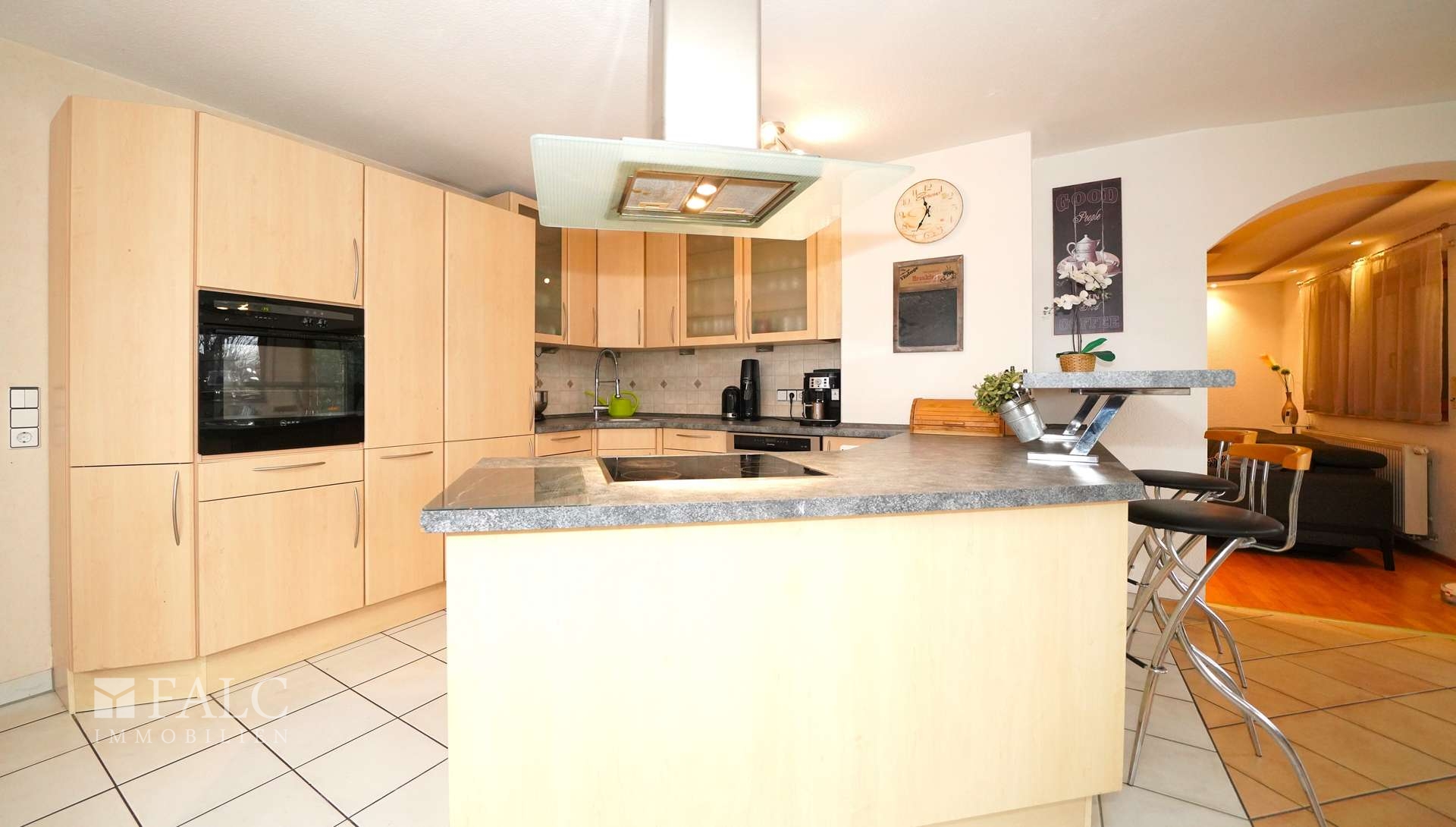 Die moderne Küchenzeile in U-Form lockt mit ausreichend Stauraum in warmer Holzoptik, einem Einbaukühlschrank, einer Spülmaschine, einem Backofen auf Körperhöhe und einem edlen Induktionskochfeld mit passendem Dunstabzug. Dies lässt das Koch- und Backherz höher schlagen und verbleibt in der Immobilie. Eine kleine Theke sorgt für Kommunikation mit der Familie, während Sie Ihren Lieben einen Snack zaubern.
