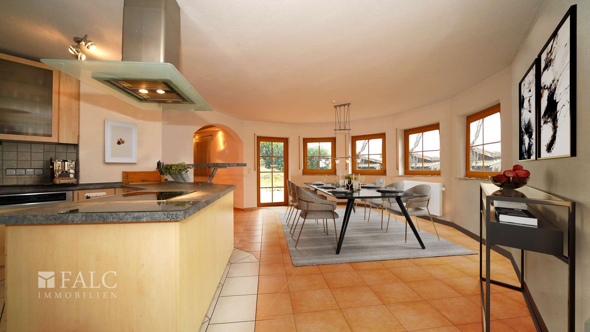 Rechter Hand lockt der Essbereich im Erker-ähnlichen Bereich des offenen, lichtdurchfluteten Wohnkonzepts. Eine große Fensterfront bietet Zugang zur großzügigen Terrasse mit elektrischer Markise und Ihrem Garten.