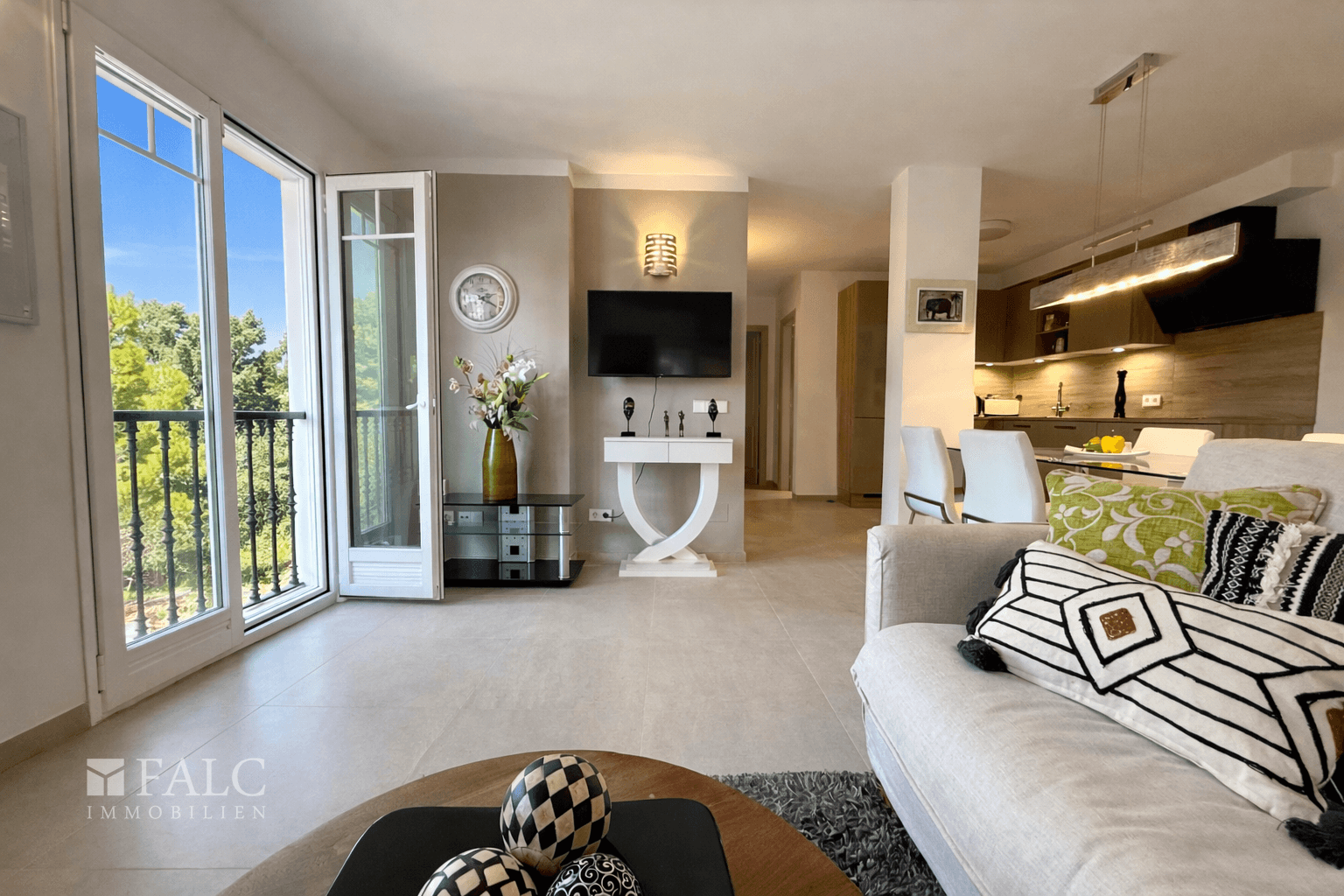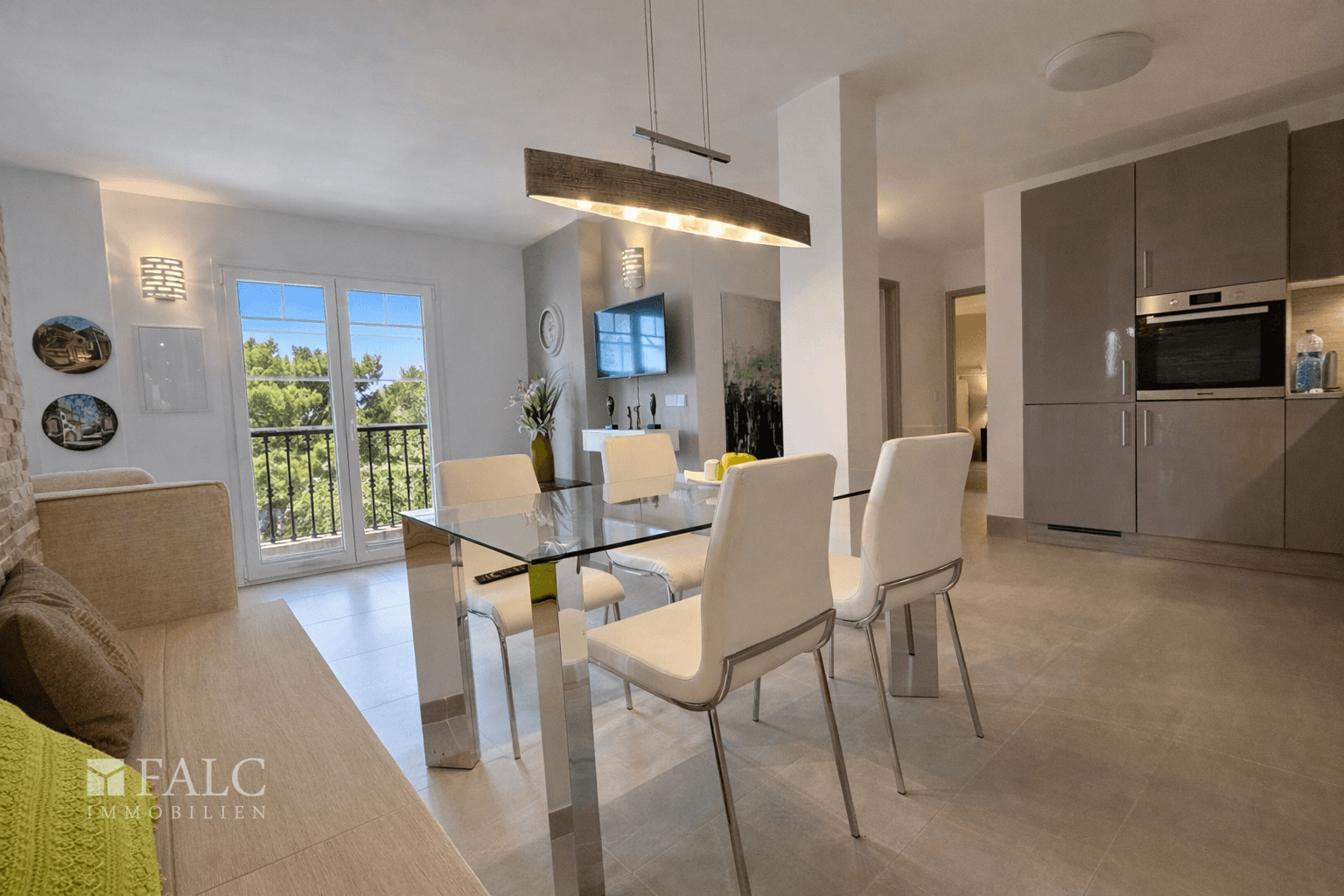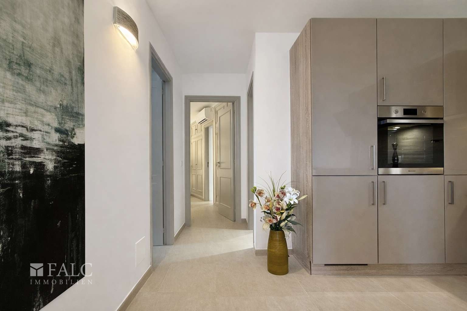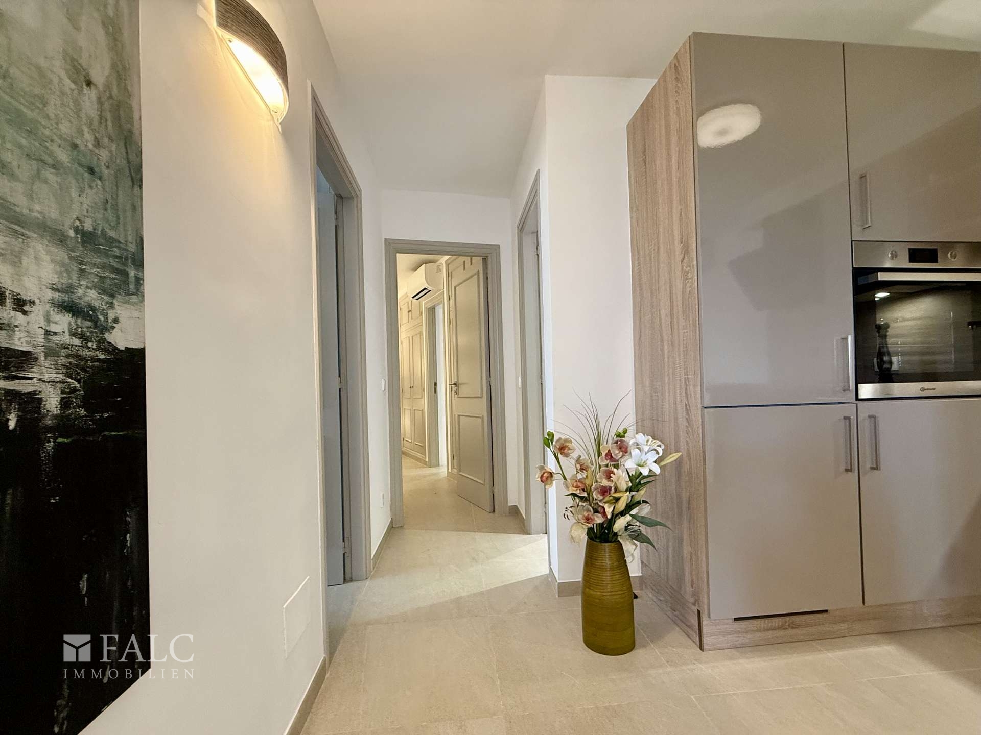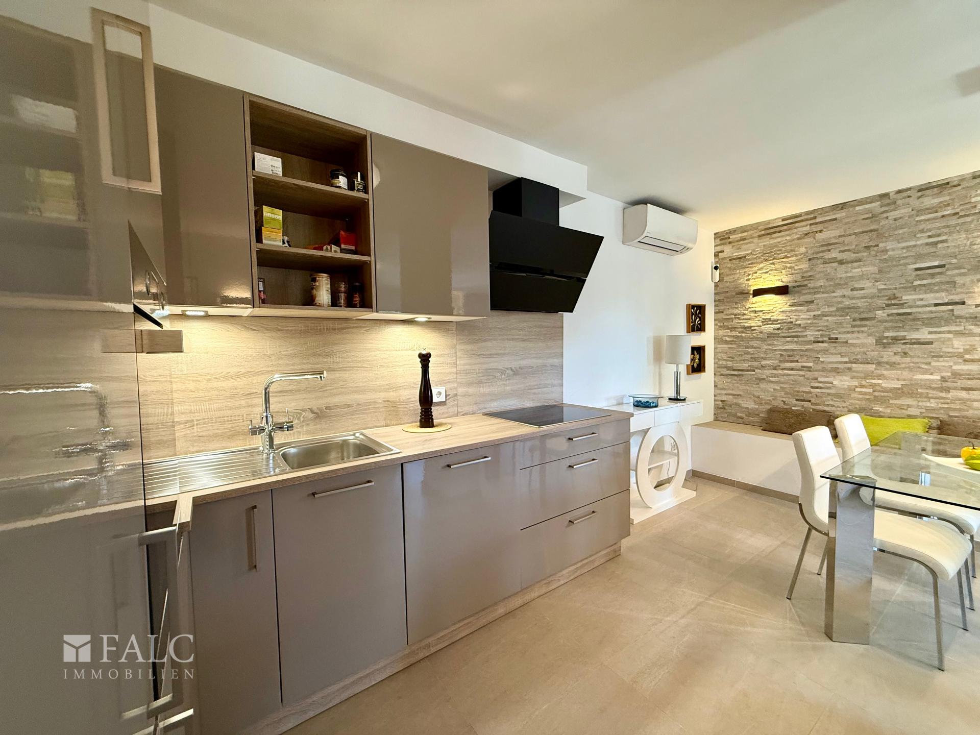 Die offene, hochwertige Nolte Einbauküche mit Bauknecht Herd ist funktional und gestalterisch klar integriert und folgt einem durchdachten, einheitlichen Farbkonzept in Grau-, Taupe- und Weißtönen, das sich konsequent durch die gesamte Wohnung zieht. Die Immobilie wurde vollständig renoviert und präsentiert sich in einem sehr gepflegten Zustand. Für ganzjährigen Wohnkomfort sorgen Klimaanlage warm/kalt sowie eine Fußbodenheizung in allen Räumen, wodurch sich die Wohnung ideal sowohl als Feriendomizil als auch für das dauerhafte Wohnen auf der Insel eignet.
