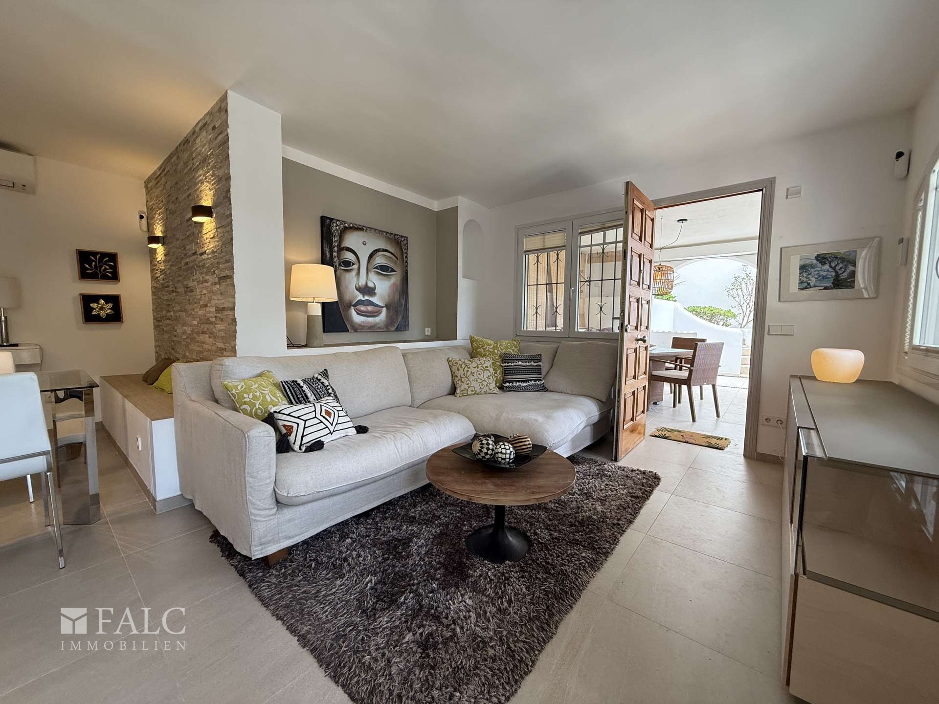 Der Zugang zur Wohnung erfolgt über einen ansprechend gestalteten Außenbereich mit einem vorgelagerten, offenen Sonnenbereich und gemauerter Liegefläche. Von hier gelangt man in die überdachte Terrasse, die als geschützter Übergang zwischen Außen- und Innenbereich dient und direkt in den hellen, offen gestalteten Wohn- und Essbereich führt.