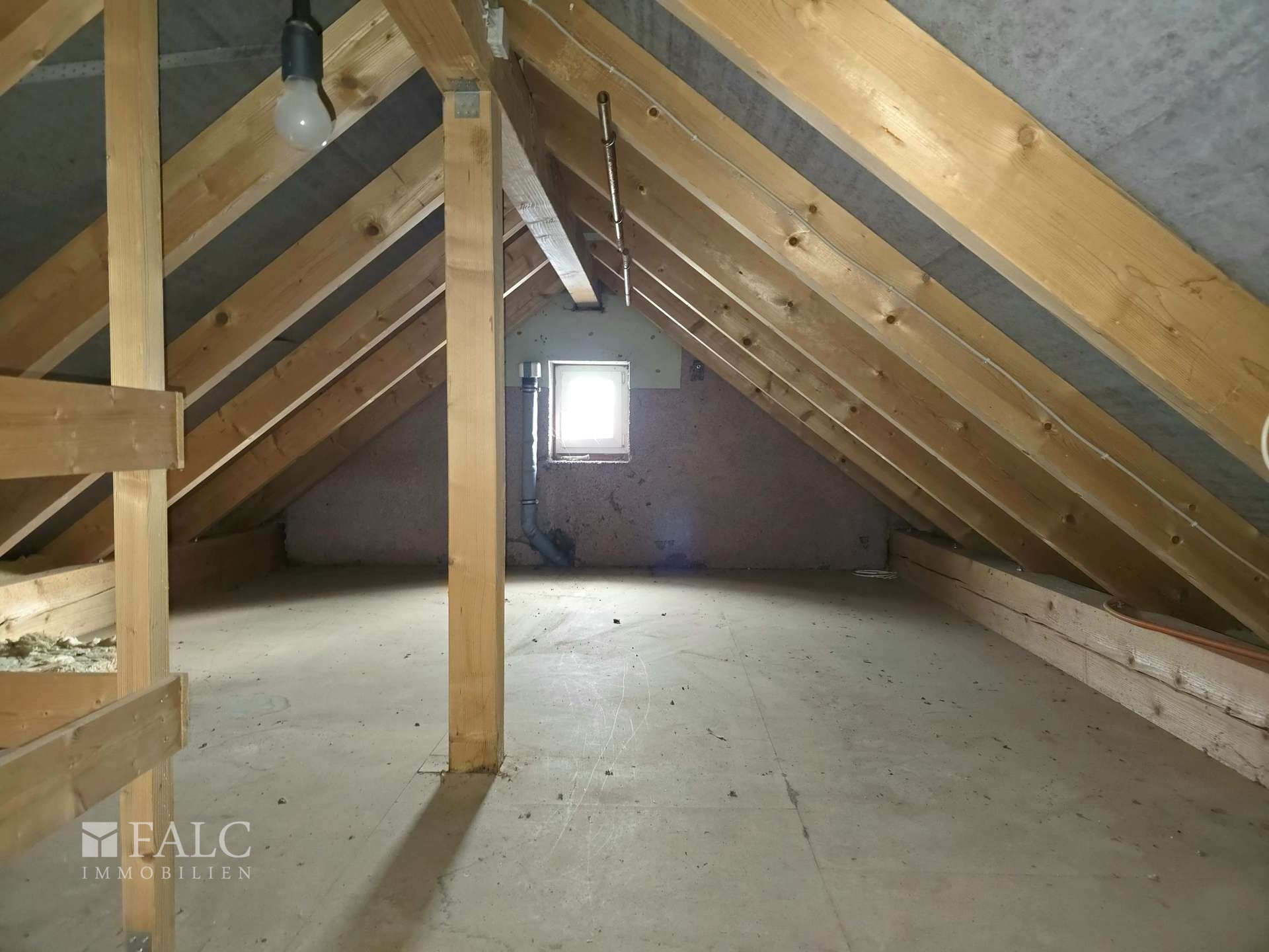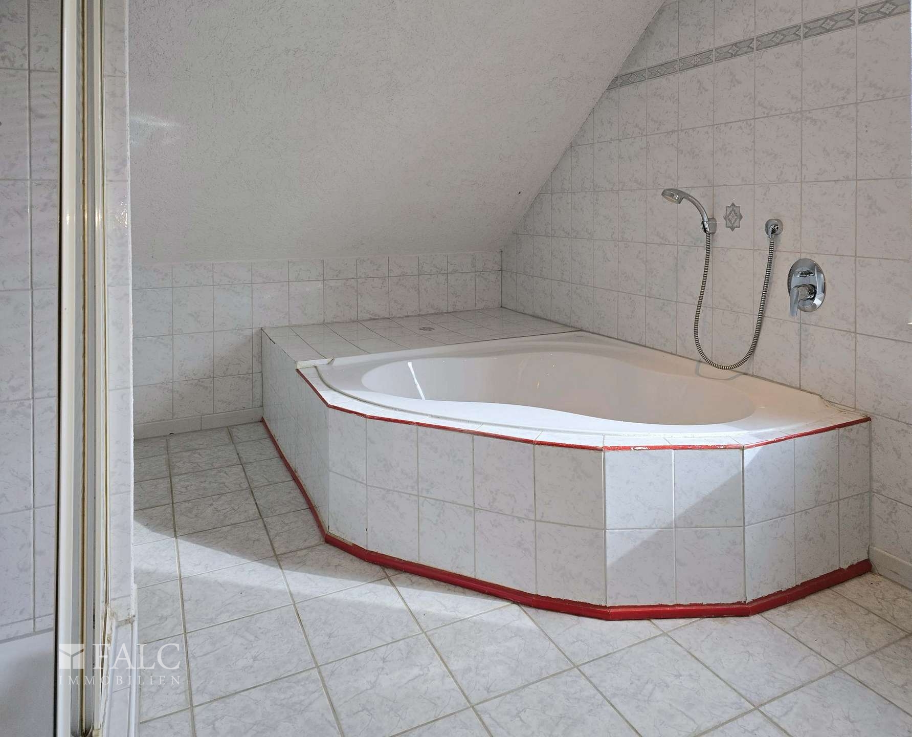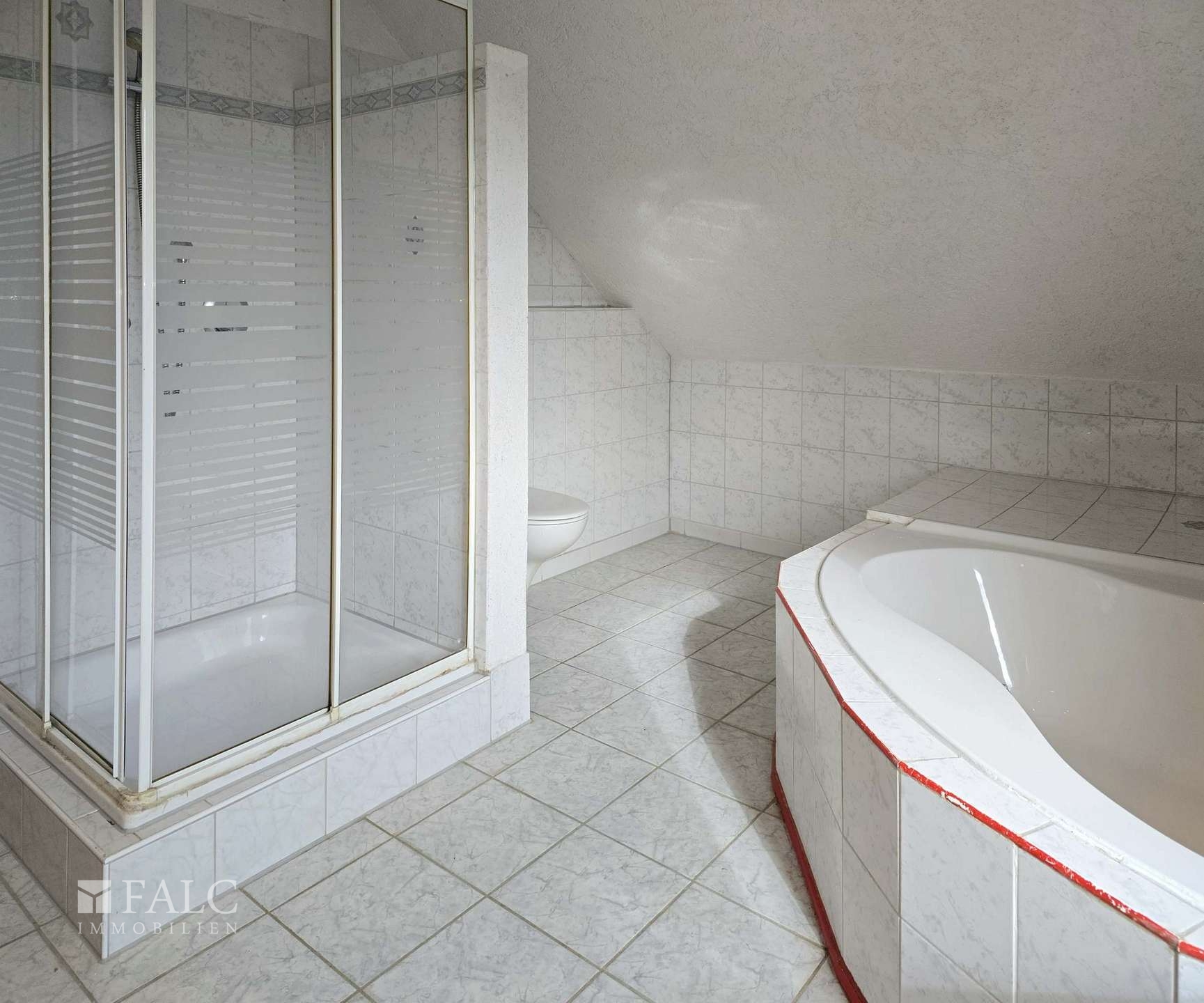 Über die Treppe gelangen Sie in das Dachgeschoss, wo Sie drei großzügige Schlafzimmer sowie das große Badezimmer erwarten. Das Badezimmer ist mit einer Eckbadewanne, einer separaten Dusche und zwei Waschbecken ausgestattet – perfekt für Familien oder Paare, die Wert auf Komfort legen. Im Obergeschoss sorgt ein Laminatboden für eine angenehme Wohnatmosphäre.