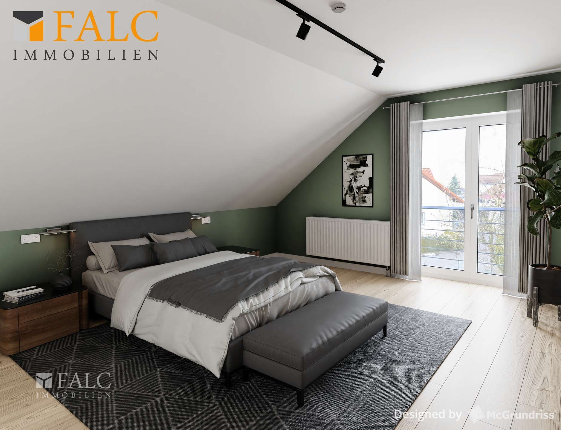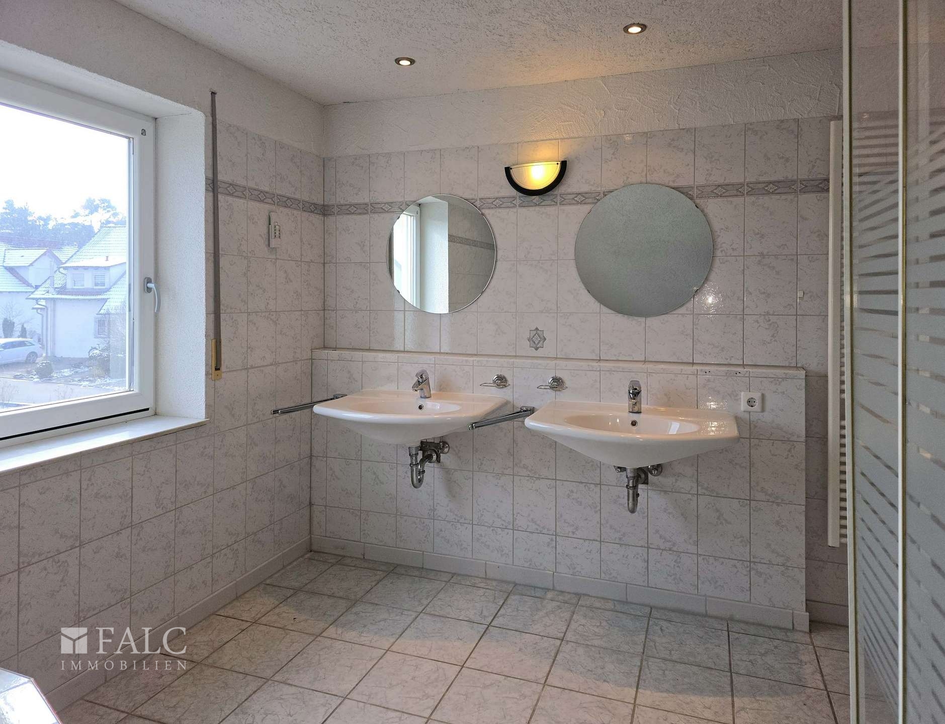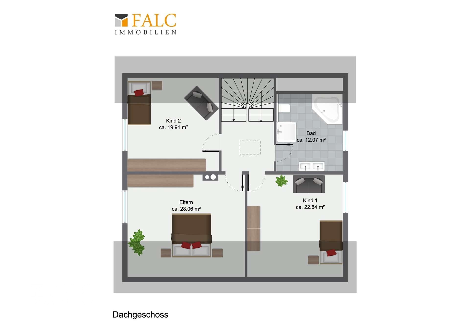 Über die Treppe gelangen Sie in das Dachgeschoss, wo Sie drei großzügige Schlafzimmer sowie das große Badezimmer erwarten. Das Badezimmer ist mit einer Eckbadewanne, einer separaten Dusche und zwei Waschbecken ausgestattet – perfekt für Familien oder Paare, die Wert auf Komfort legen. Im Obergeschoss sorgt ein Laminatboden für eine angenehme Wohnatmosphäre.