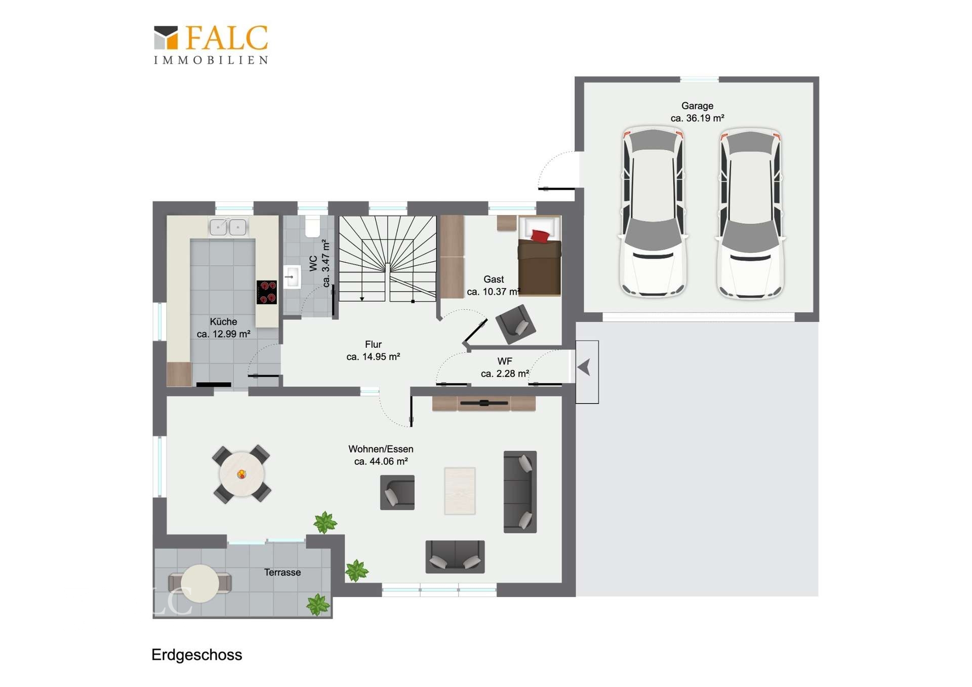 Im Erdgeschoss befinden sich neben dem Wohn- und Essbereich auch ein praktisches Gäste-WC sowie eine Gästezimmer. Der Fliesenboden im gesamten Erdgeschoss sorgt für ein pflegeleichtes Ambiente.