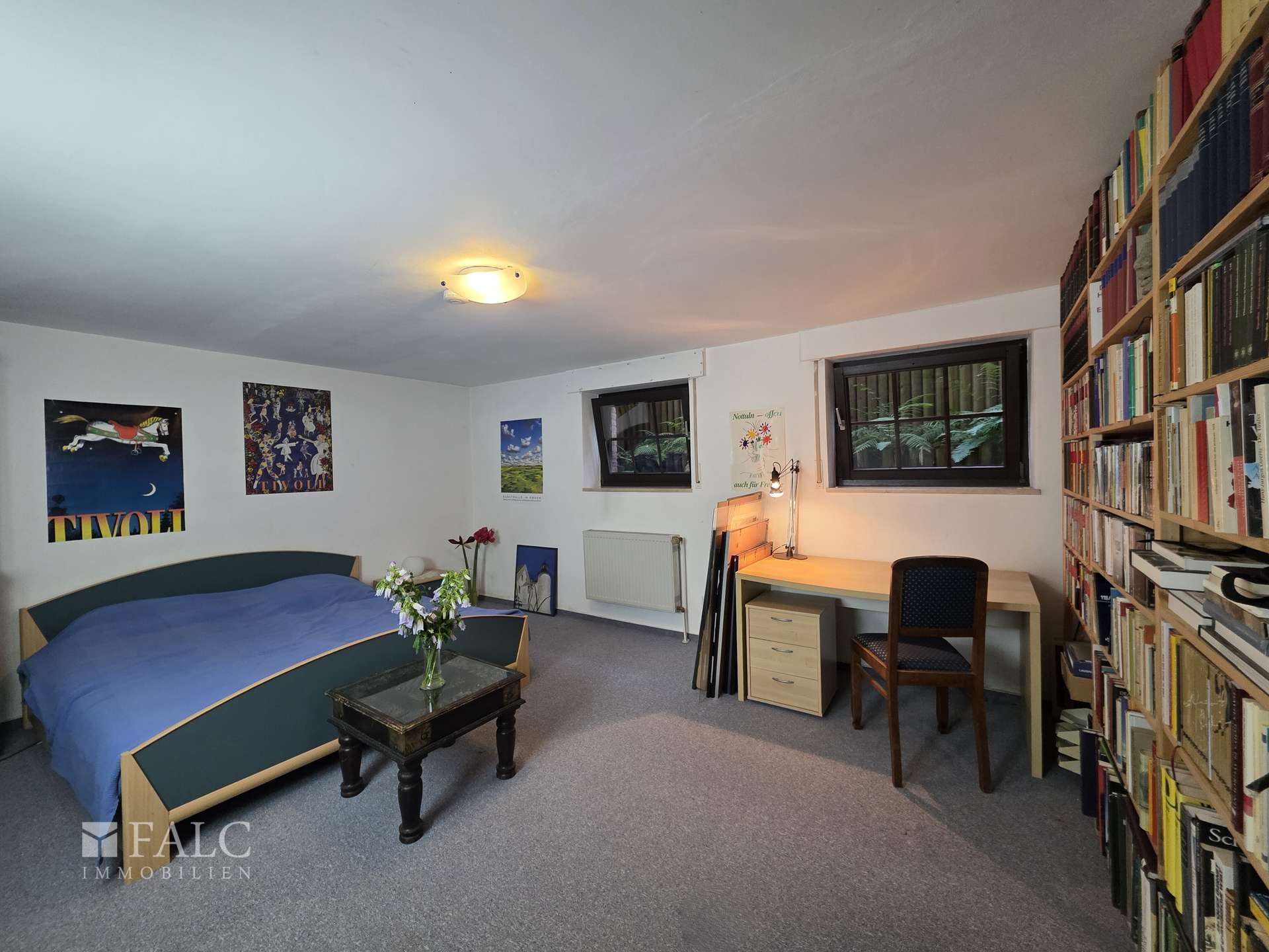 Dank der breiten Tageslichtfenster entsteht ein einladendes Raumgefühl, das eine vielfältige Nutzung als Wohn-, Arbeits- oder Hobbyraum gleichermaßen ermöglicht. Der Bereich wird derzeit wohnlich genutzt.