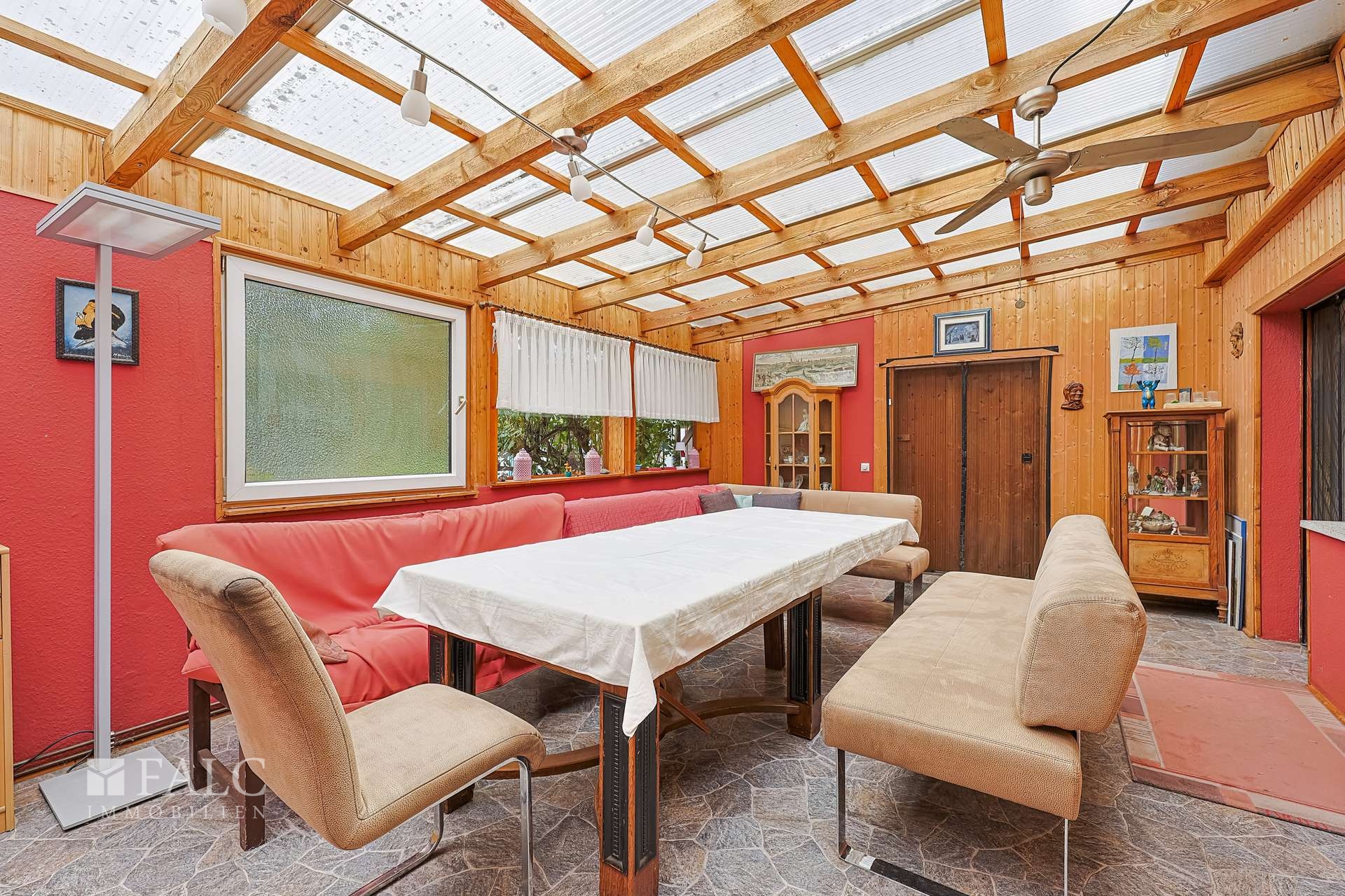 Ein besonderes Highlight ist der Wintergarten – ideal als zusätzlicher Aufenthaltsraum mit Blick ins Grüne. Für heiße Sommertage ist eine nachträgliche Verschattung empfehlenswert, um starkes Aufheizen zu verhindern. Für solch warme Tage bietet sich jedoch ohnehin die überdachte Terrasse im Garten an – sie liegt separat vom Haus und ist perfekt für Grillabende oder Kindergeburtstage im Grünen.