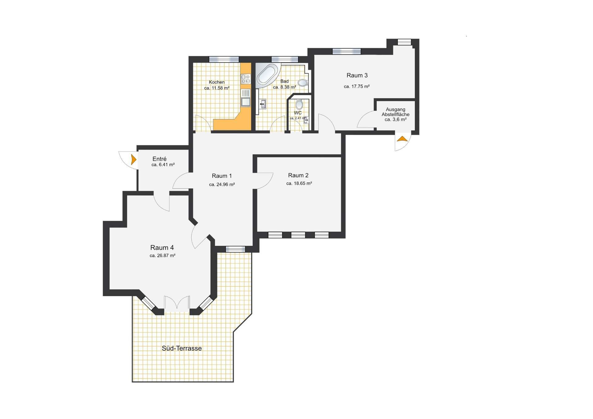Der zentrale Hauptraum mit ca. 27 m² überzeugt durch große Südfenster und den direkten Zugang zur Terrasse. Von hier genießen Sie den Blick auf ein parkähnliches Grundstück – ein Pluspunkt für eine erholsame Pause im Freien.