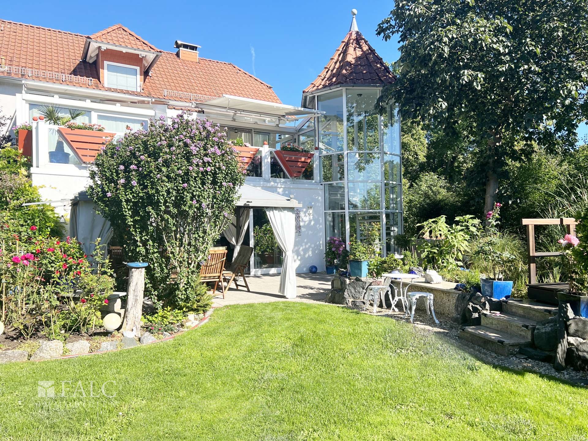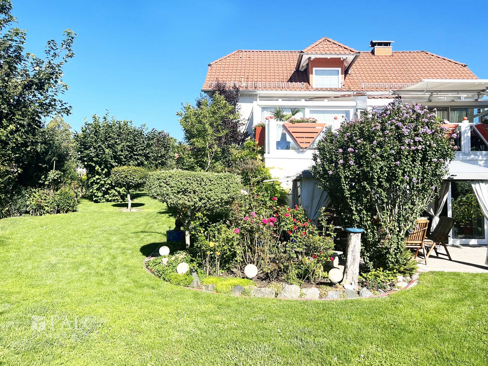 Die weitläufige Gartenanlage mit Koi-Teich, Sonnenterrasse und dichter Hecke garantiert Privatsphäre und ein Paradies im Grünen.