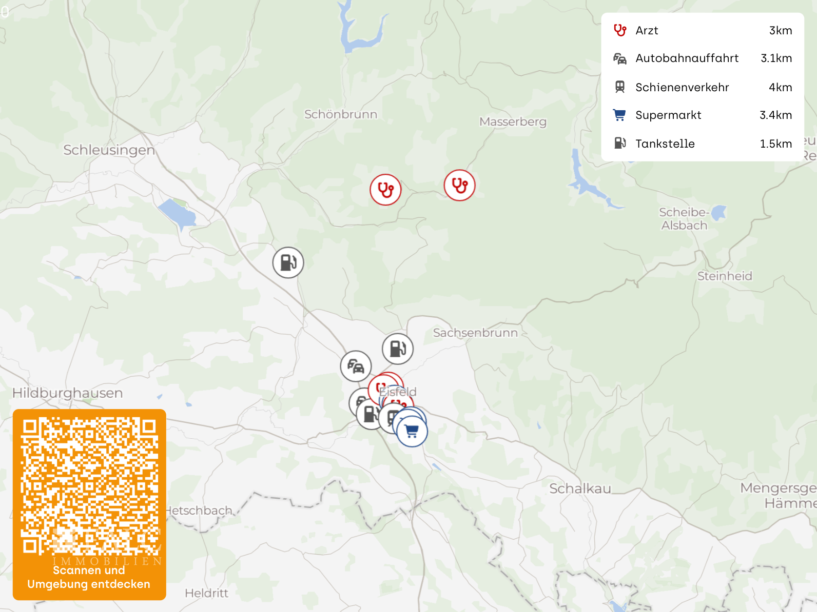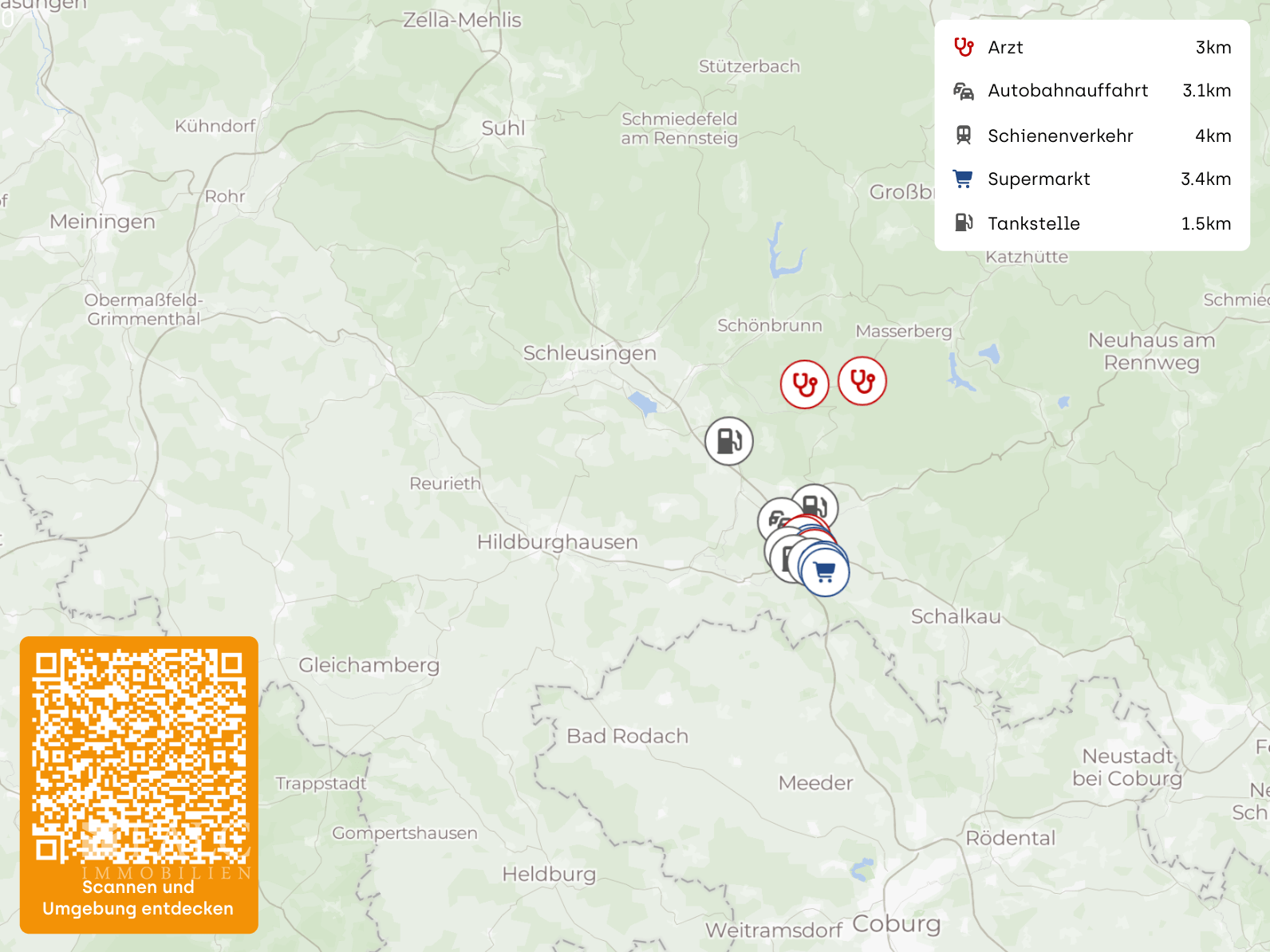 In der weiteren Umgebung liegen die Städte Sonneberg, Coburg und Hildburghausen, die zusätzliche Infrastruktur, Einkaufsmöglichkeiten und kulturelle Angebote bieten. Über die Bundesstraße B281 besteht eine gute Anbindung an das regionale Verkehrsnetz sowie an die Autobahnen in Richtung Bayern und Südthüringen. Damit verbindet die Lage der Reitanlage naturnahes, ruhiges Arbeiten mit einer für den Betrieb und die Vermietung wichtigen verkehrlichen Erreichbarkeit.