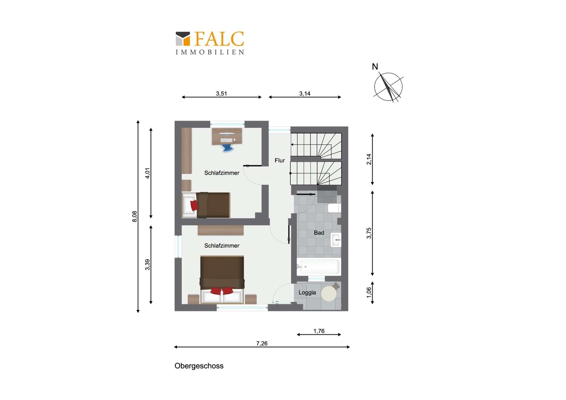 Im Obergeschoss erwartet Sie der gemütliche Schlafbereich mit zwei gut geschnittenen Zimmern, ideal als Kinderzimmer, Elternschlafzimmer oder Homeoffice. Die kleine Loggia lädt zu ruhigen Momenten ein – perfekt für den ersten Kaffee am Morgen oder einen Blick in den Sonnenuntergang. Das Bad ist funktional gestaltet und bietet Raum für Ihre Modernisierungsideen.