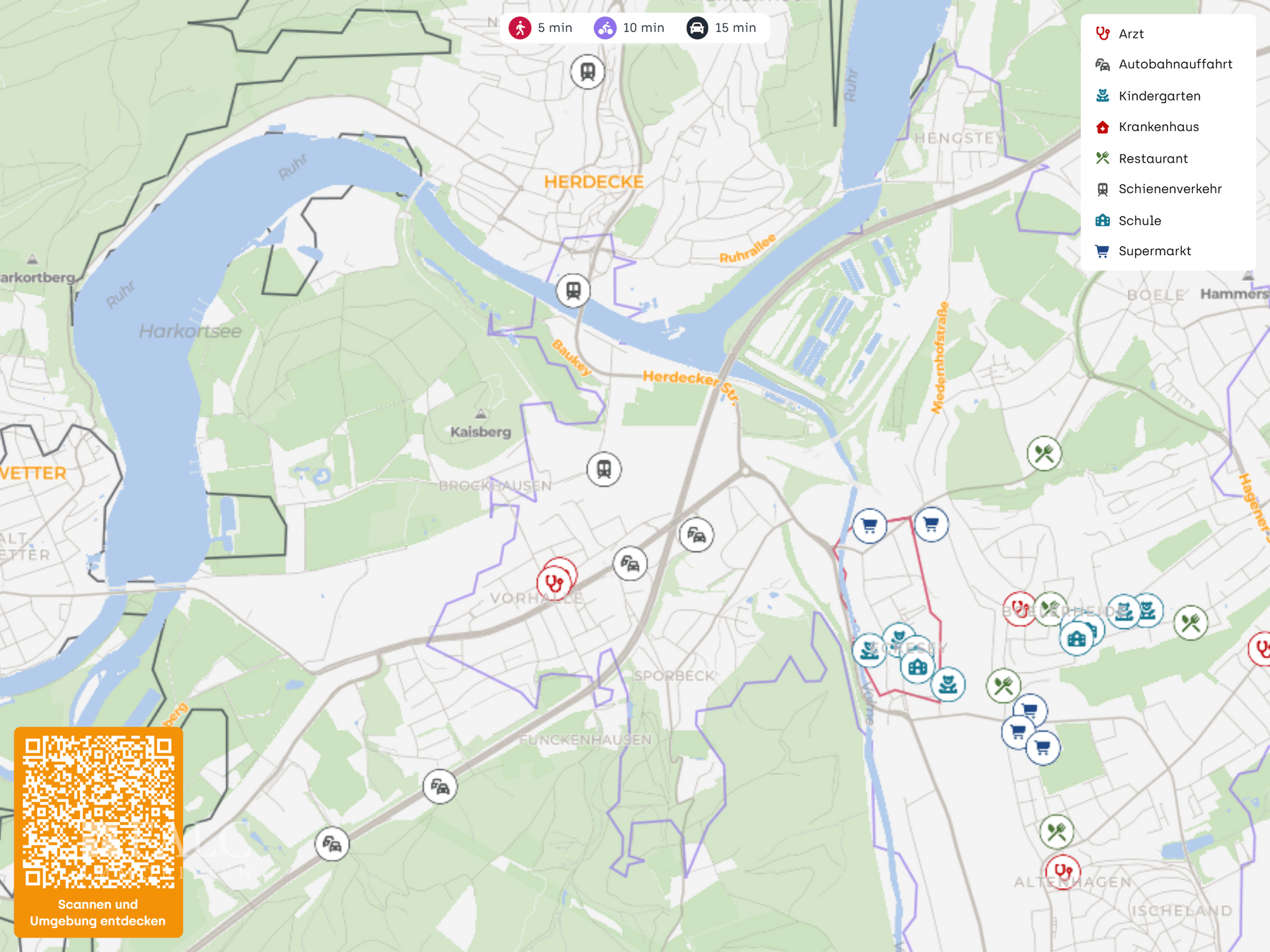 Besonders hervorzuheben ist der hohe Freizeit- und Erholungswert dieser Lage. In nur wenigen Minuten erreichen Sie Herdecke, die Ruhr und den beliebten Harkortsee – ein echtes Highlight für Naturfreunde, Spaziergänger und Sportbegeisterte. Hier können Sie Segeln, Rudern, Joggen, Radfahren oder einfach den Blick aufs Wasser genießen. Auch das bekannte Freilichtmuseum Hagen ist schnell erreichbar und bietet spannende Einblicke in Handwerk und Geschichte – ein lohnendes Ziel für Ausflüge mit Familie oder Freunden.