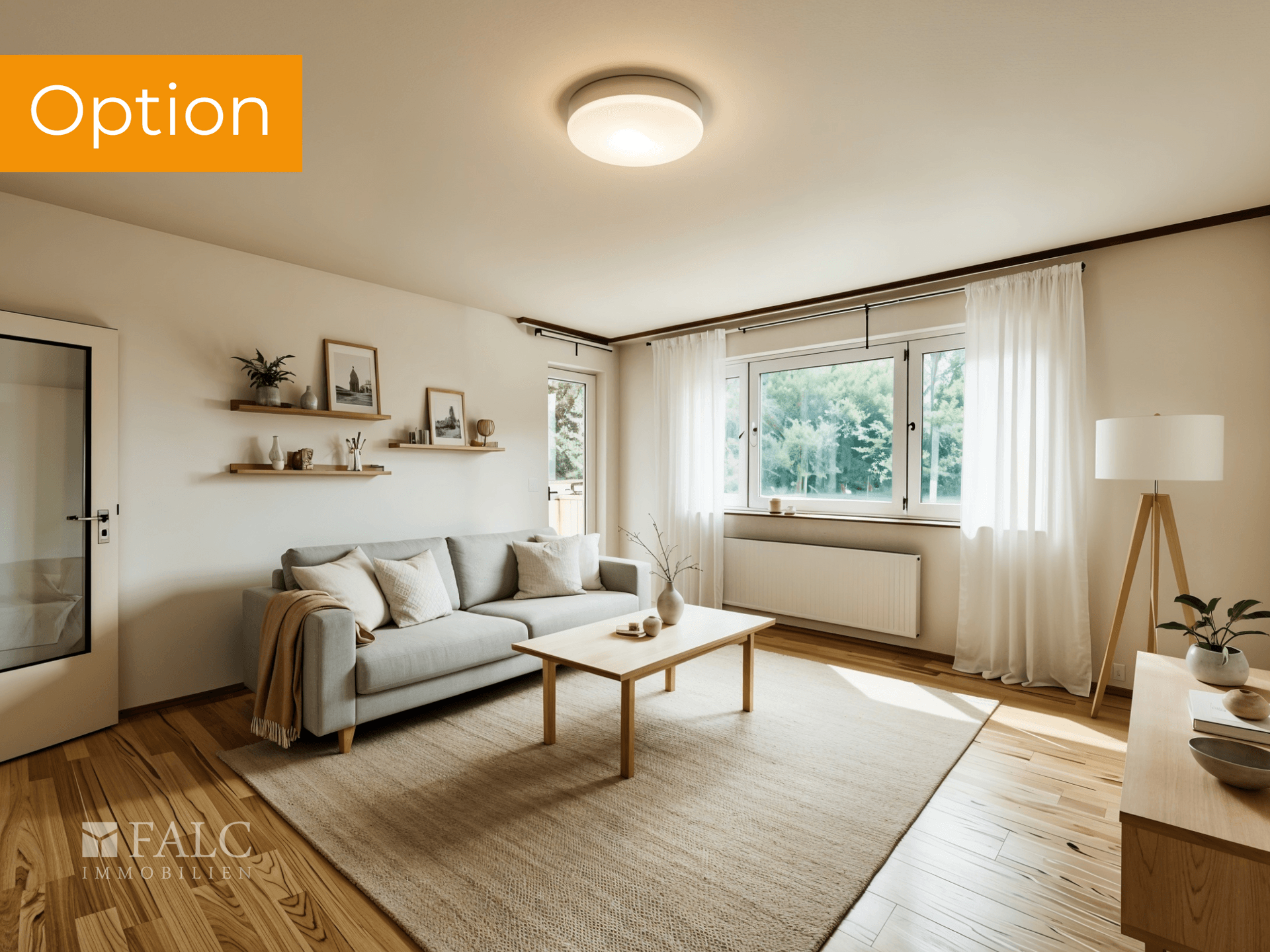 Das lichtdurchflutete Wohnzimmer bietet ausreichend Raum für gemütliche Stunden und direkten Zugang zum Südbalkon, der Ihnen sonnige Nachmittage mit Blick ins Grüne garantiert.