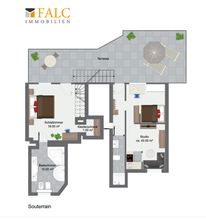 Aktuell sind der Garten, das Studio und die Vorterrasse exklusiv dieser Wohneinheit zugeordnet.