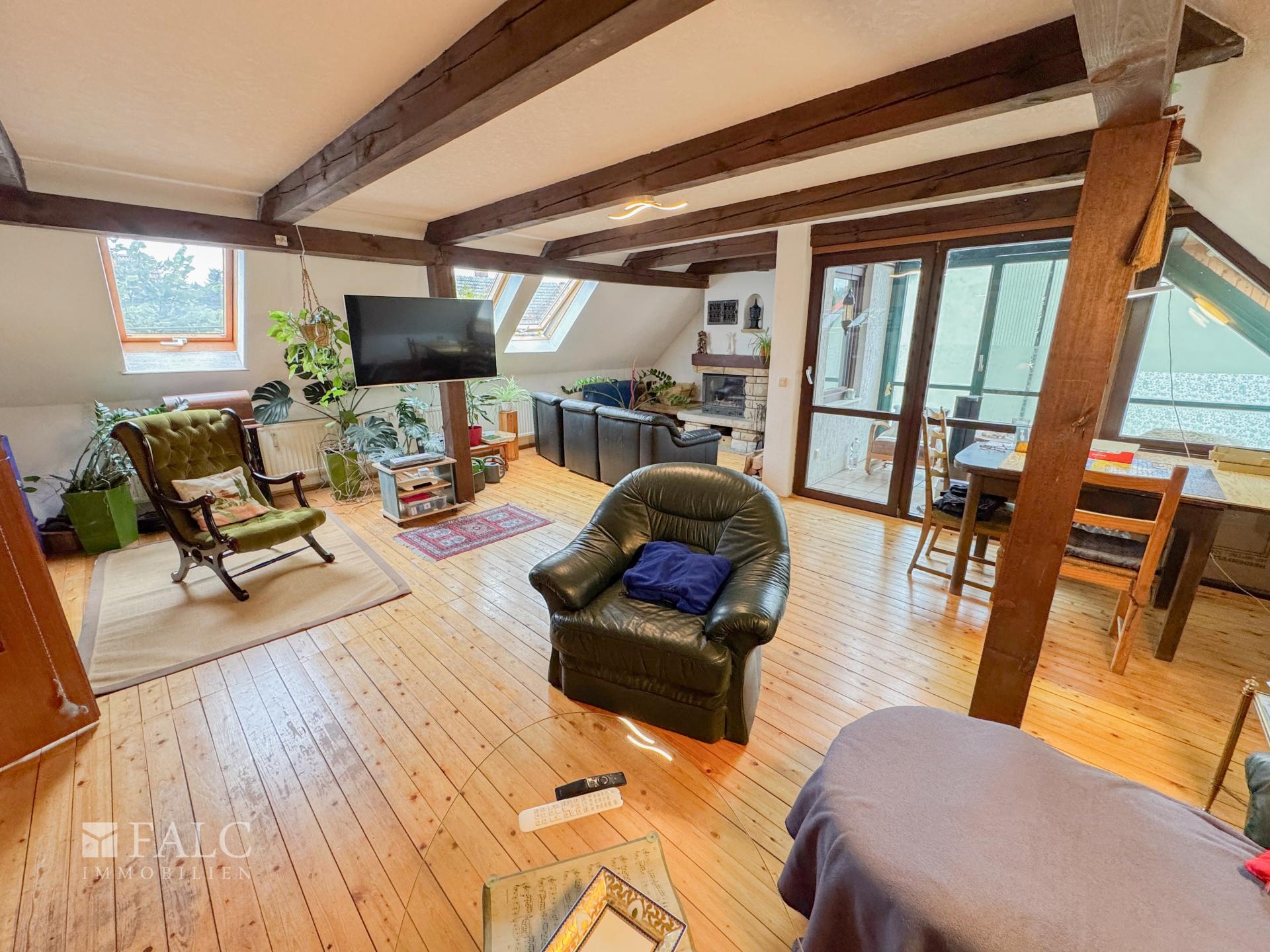 Im Obergeschoss: ein Schlafzimmer, das großzügige Masterbad (2017) und ein großes Wohnzimmer mit Loggia/Wintergarten – hier sorgt ein Kamin für Atmosphäre (Wohnzimmer-Kamin 2017). Eine kleine Treppe führt vom OG-Flur in den Spitzboden – perfekt als Stauraum.