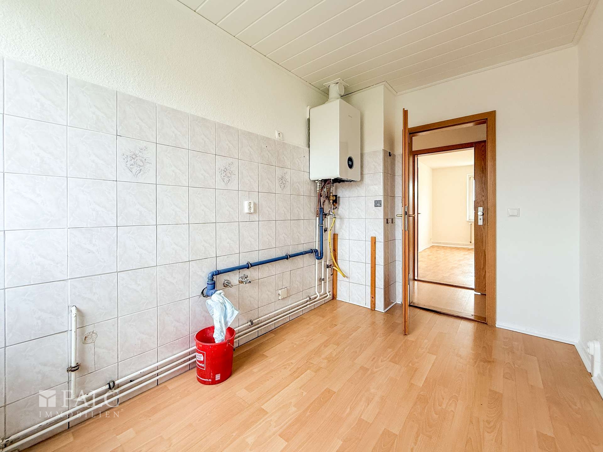 Zurück im Flur, führt der Weg weiter in die Küche. Diese ist funktional gestaltet und bietet genügend Platz für alle notwendigen Küchengeräte. Die Fenster sorgen für eine angenehme Belüftung und Helligkeit.