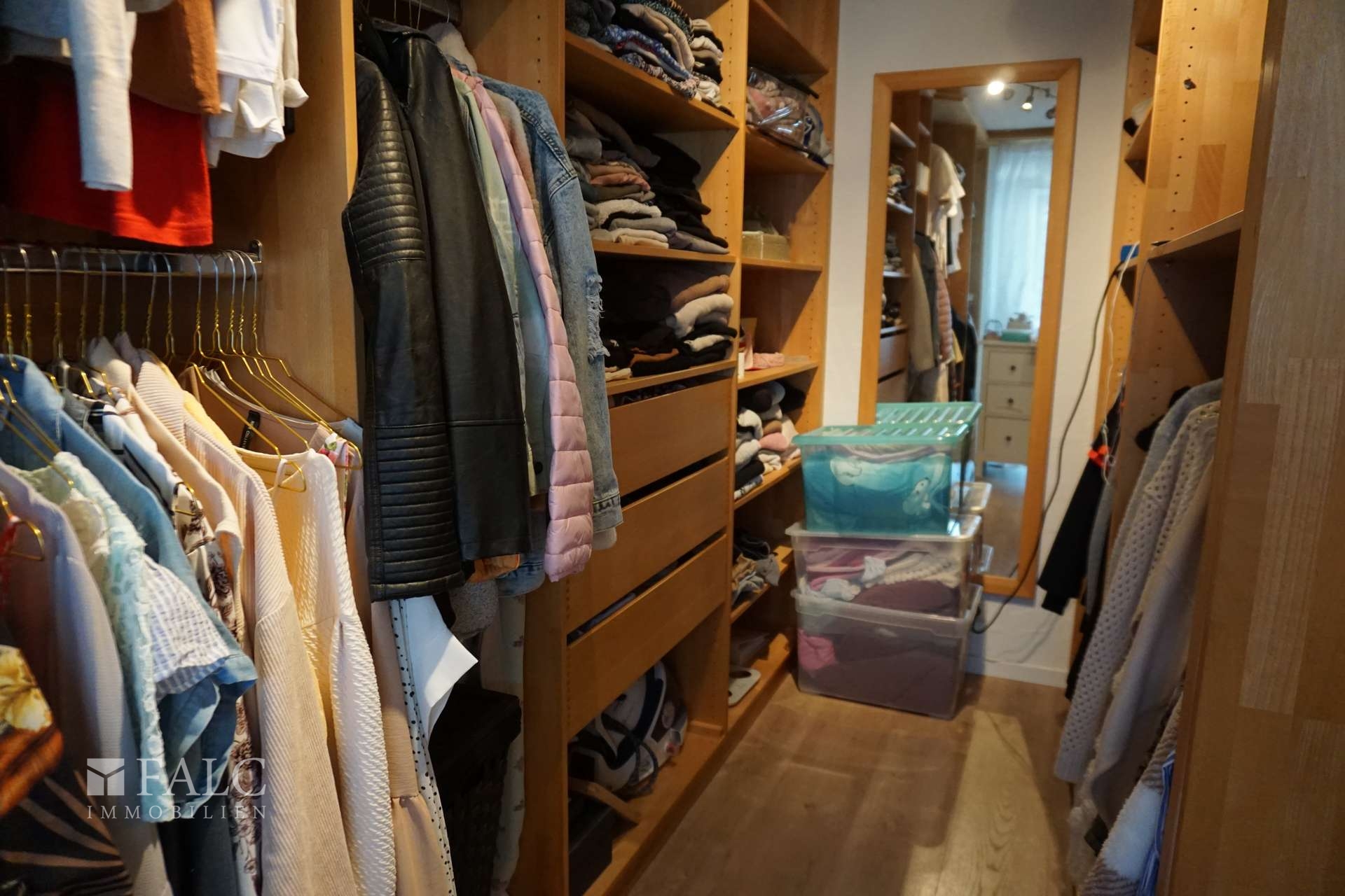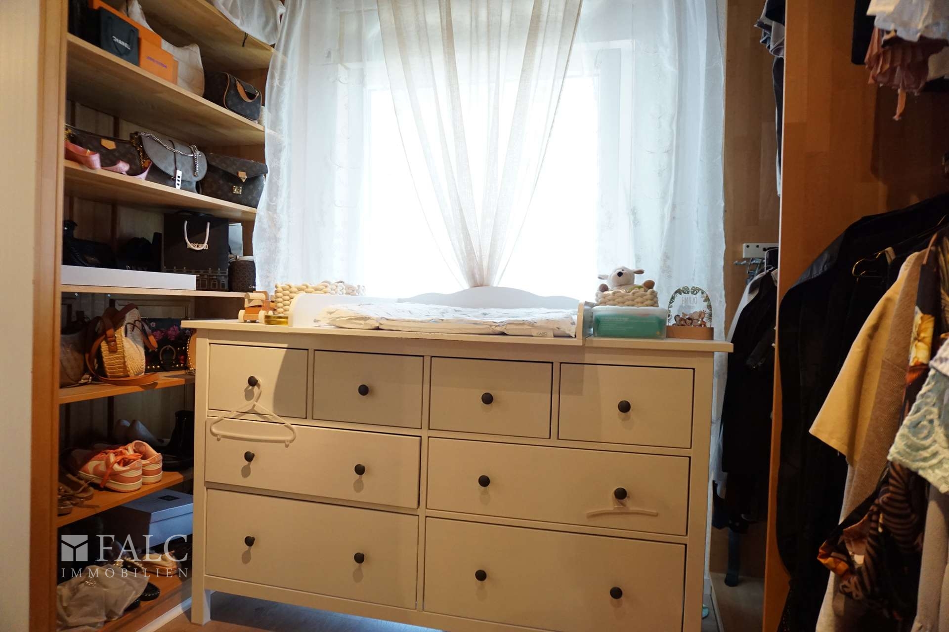 Schlafzimmer mit begehbarem Kleiderschrank und Balkonzugang