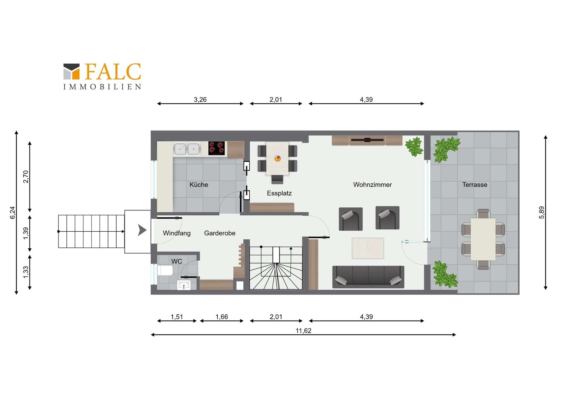 Im Erdgeschoss erwartet Sie eine offene und helle Raumgestaltung: Die moderne Einbauküche ist direkt in den großzügigen Wohn- und Essbereich integriert. Von hier aus gelangt man auf die Terrasse und in den gepflegten Garten – ideal für entspannte Stunden im Freien. Ein Flur mit Garderobenbereich sowie ein Gäste-WC komplettieren das Erdgeschoss.