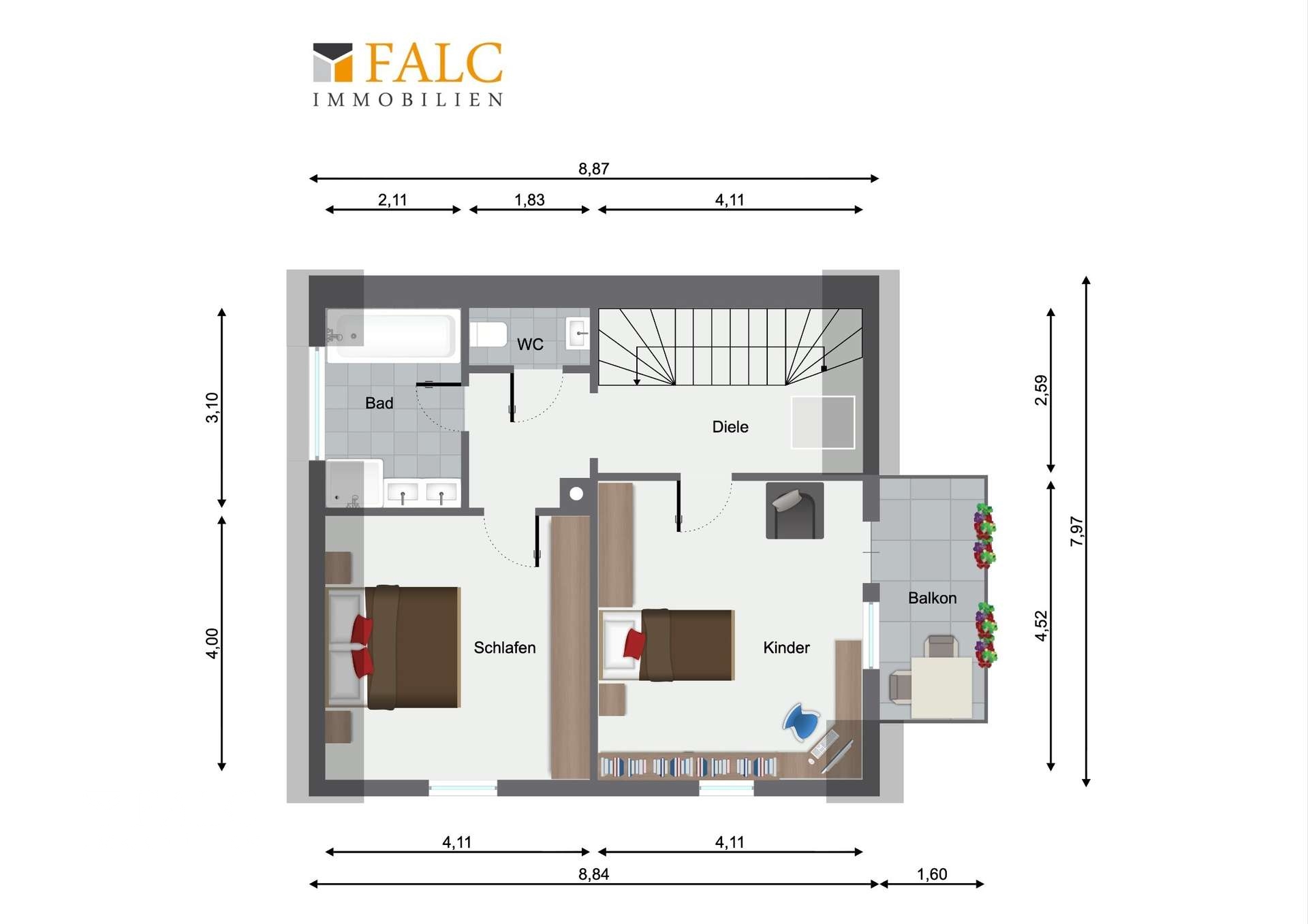 Obergeschoss: 2 Schlafzimmer (eines mit Balkon), Tageslichtbad mit Wanne und Dusche, separates WC