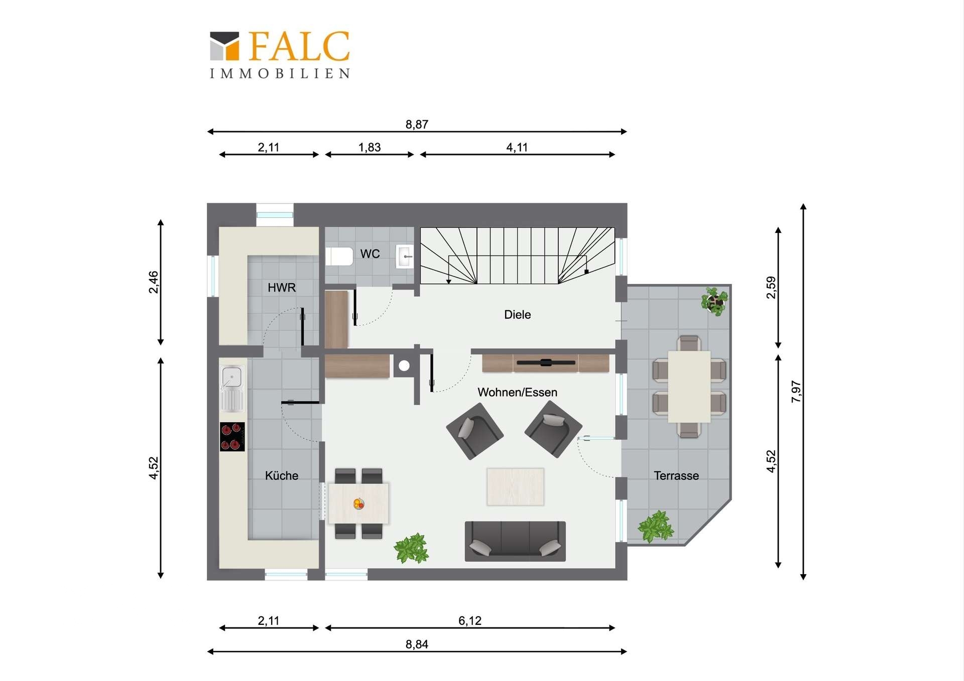 Erdgeschoss: Wohn- und Esszimmer mit Terrasse, Küche, Abstellraum, Gäste-WC und Flur