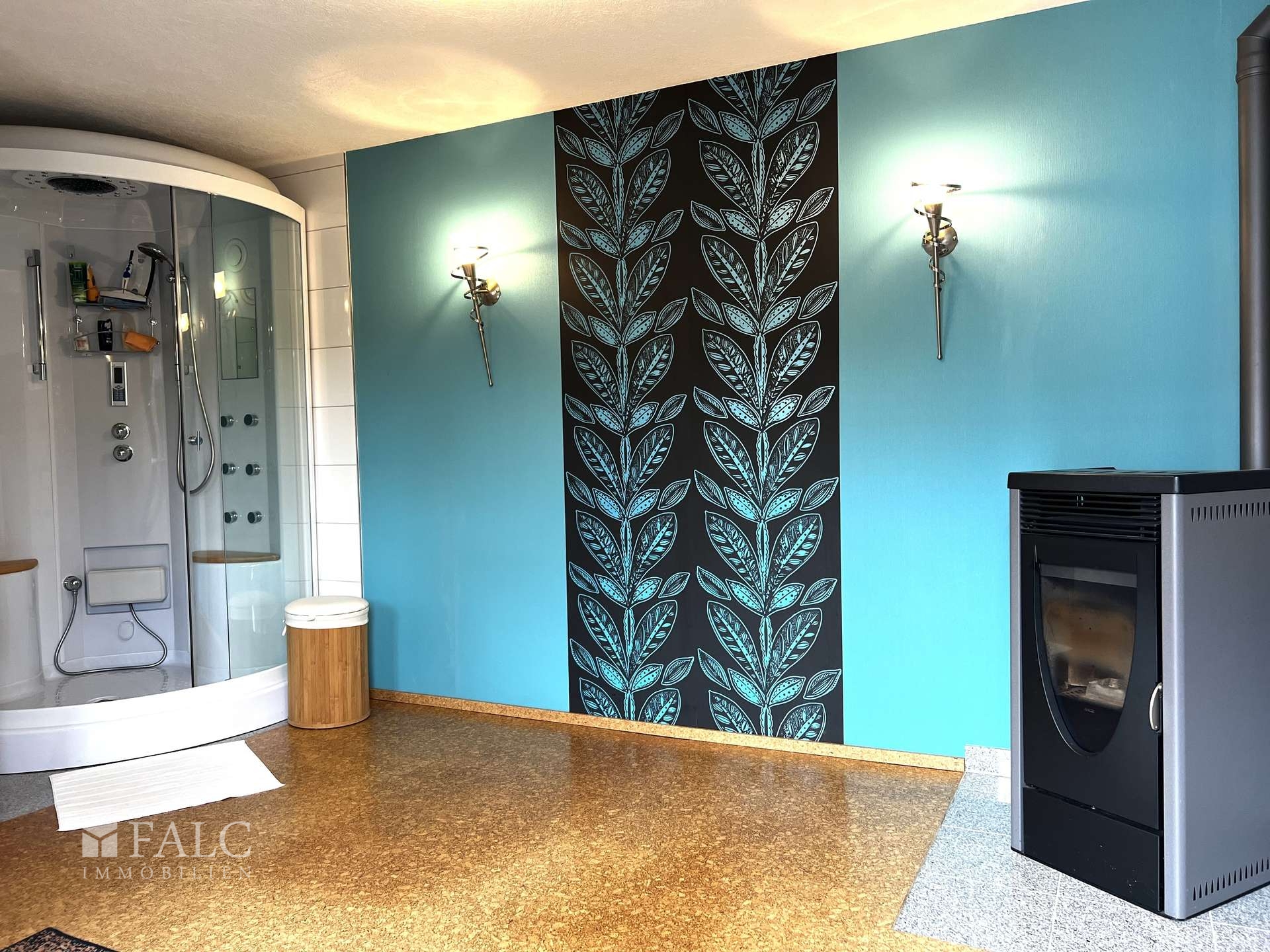 Wellnesshaus mit Ruhebereich und Pelletofen, Tageslichtbad und großer Sauna